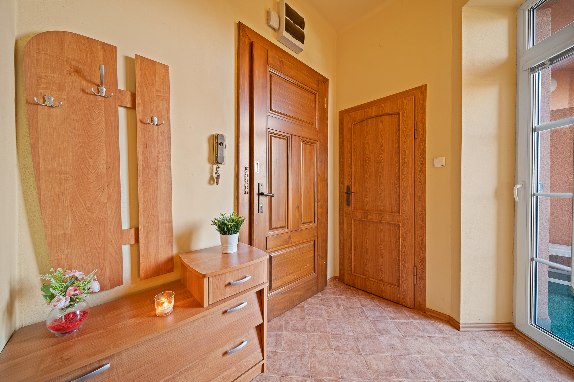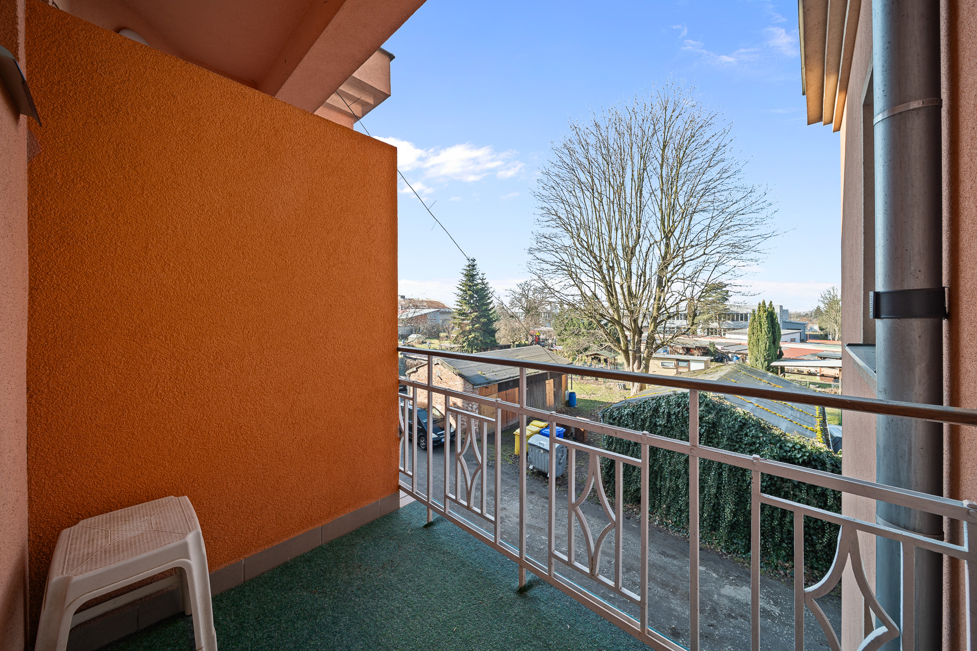 Byt i balkón je orientovaný na západ, do klidně části s výhledem na zahrady.