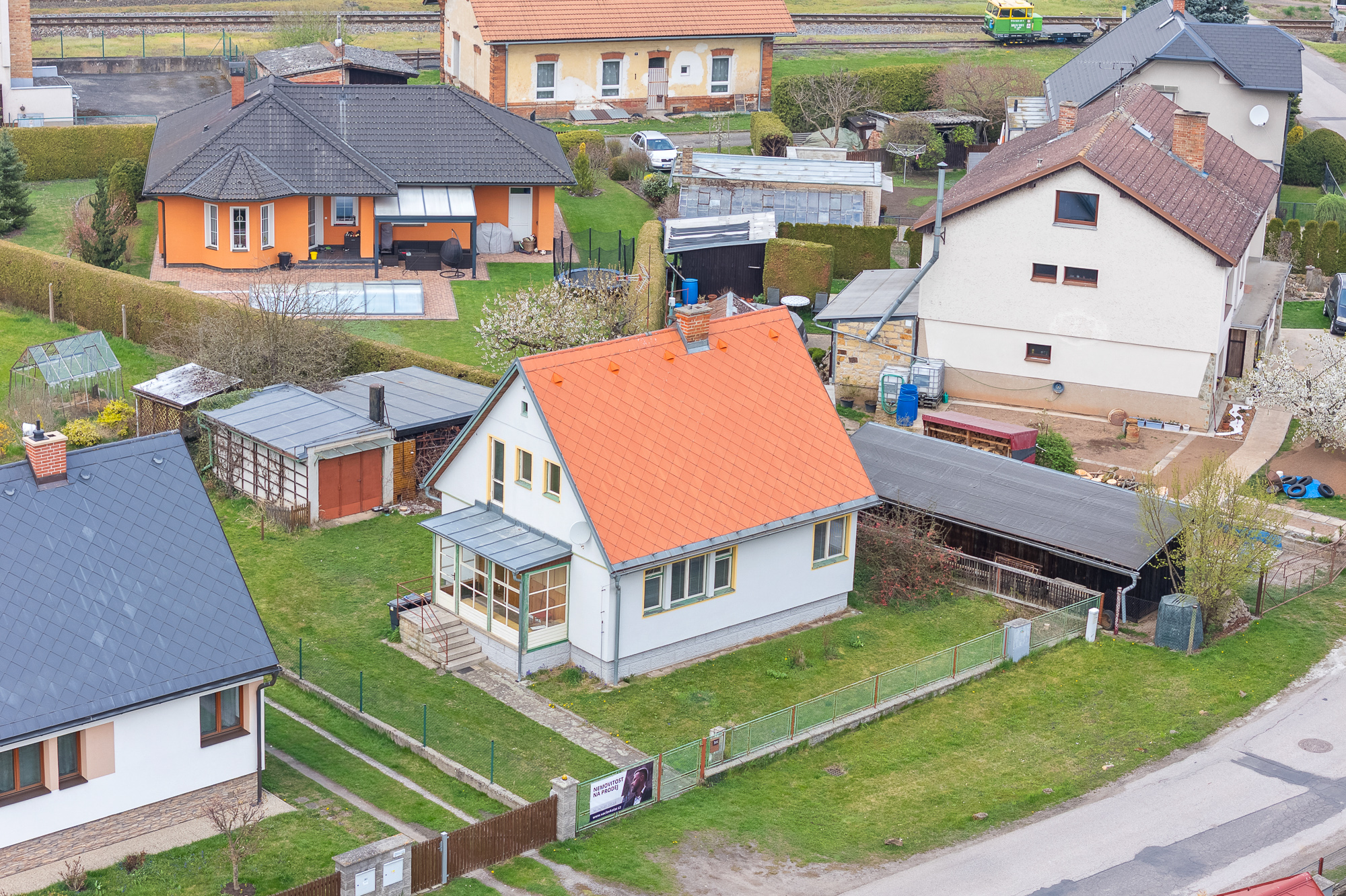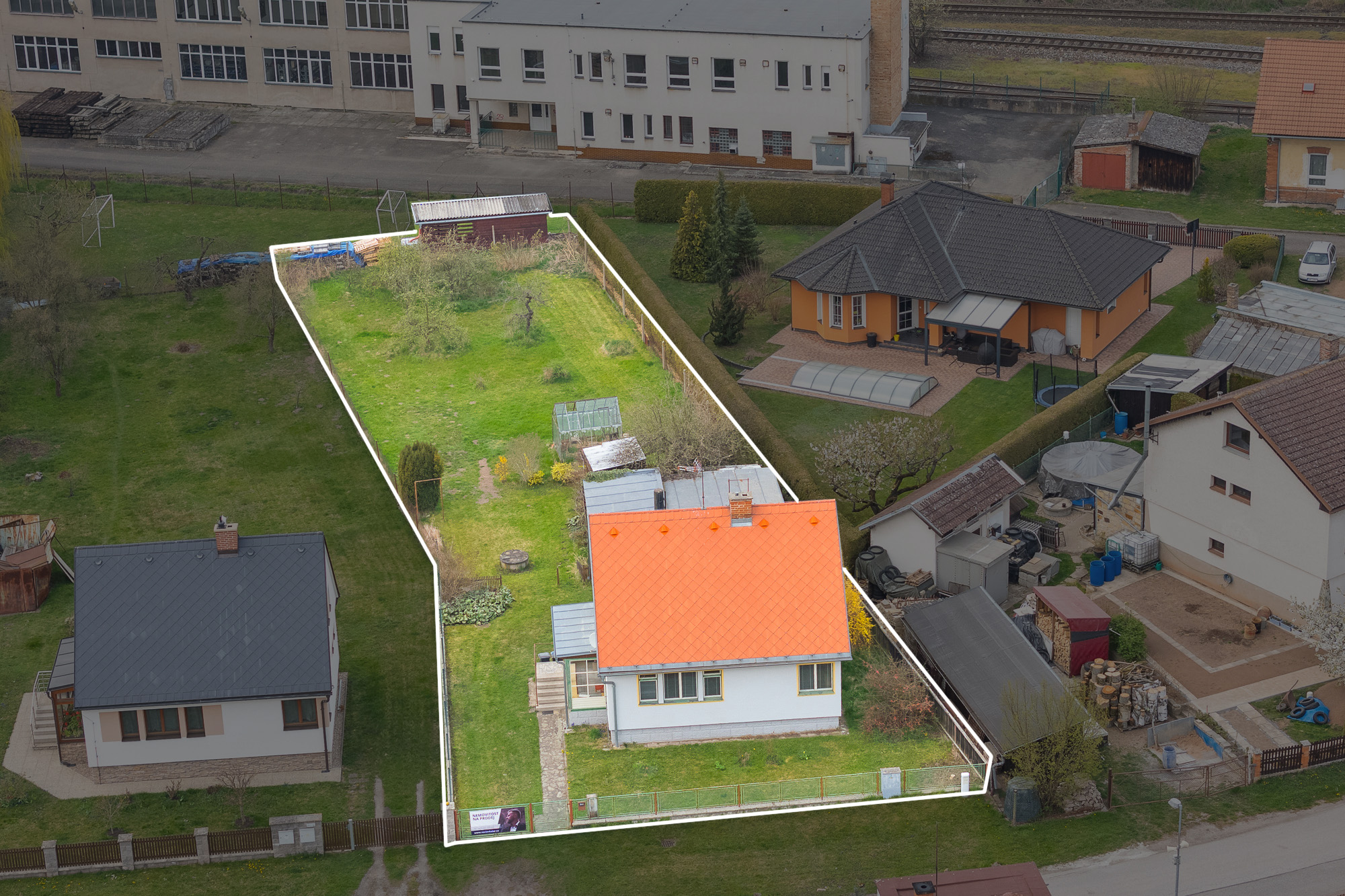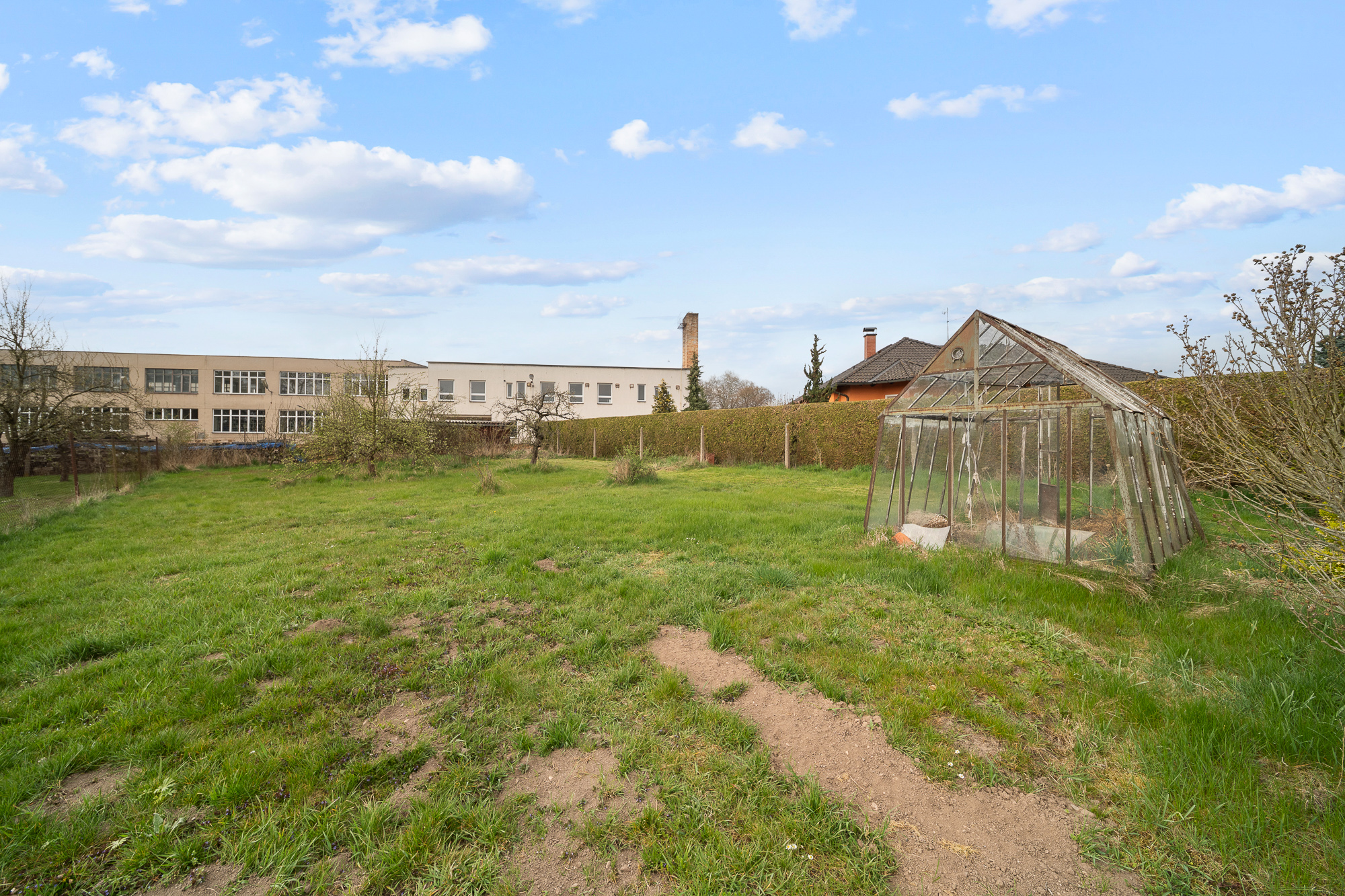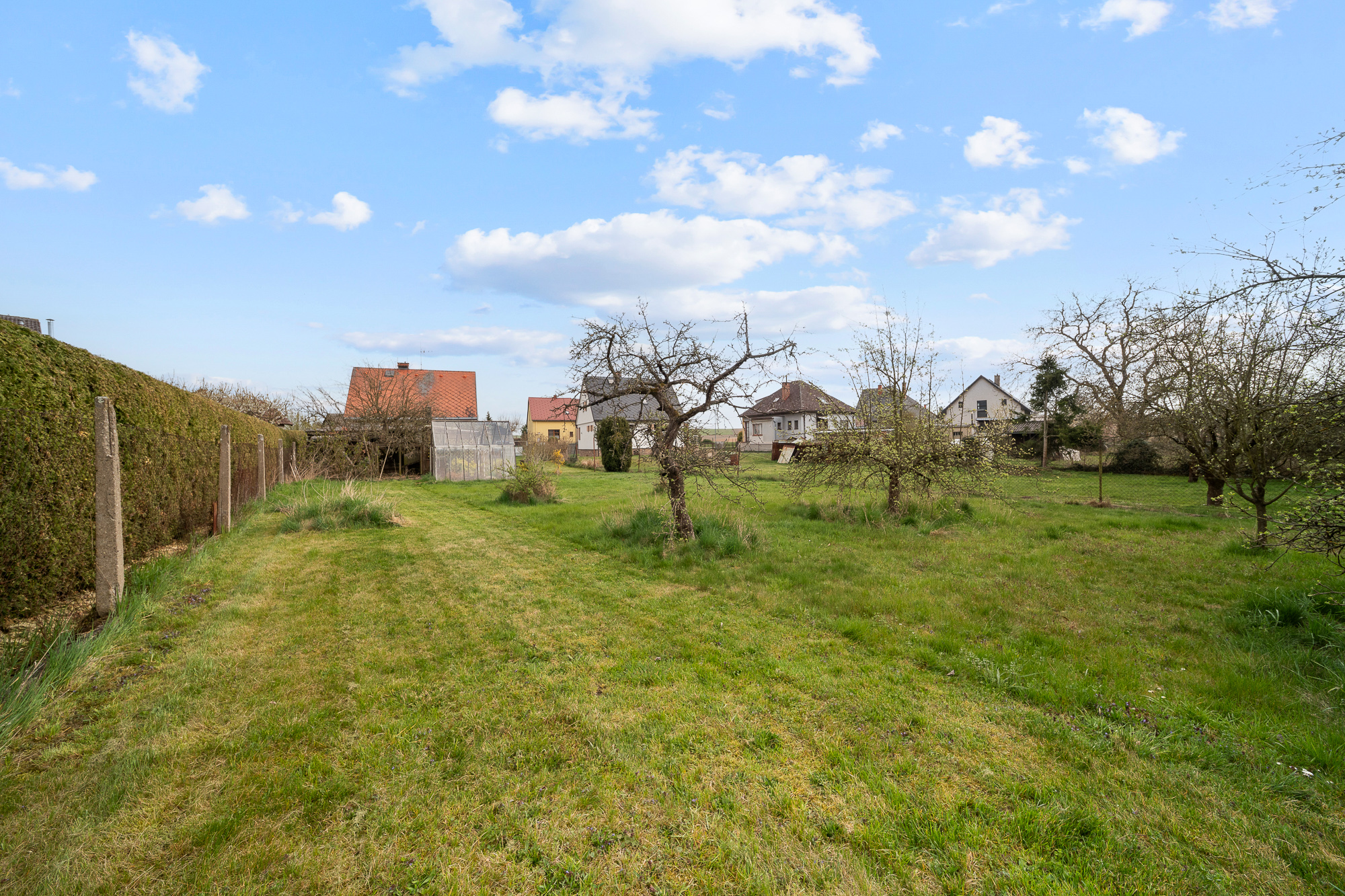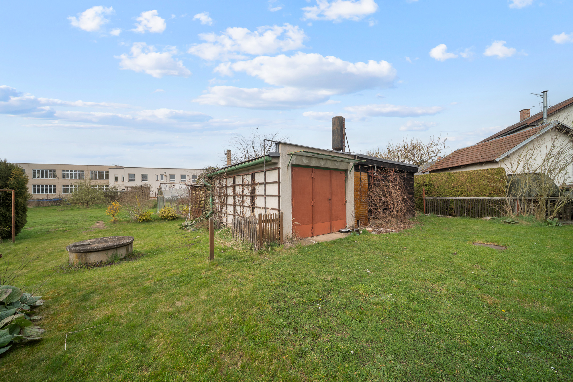 Pozemek má obdélníkový tvar, je oplocený, udržovaný a osázený ovocnými stromy. Najdete zde také skleník, zděnou garáž, kůlnu a studnu s užitkovou vodou vhodnou k zalévání.