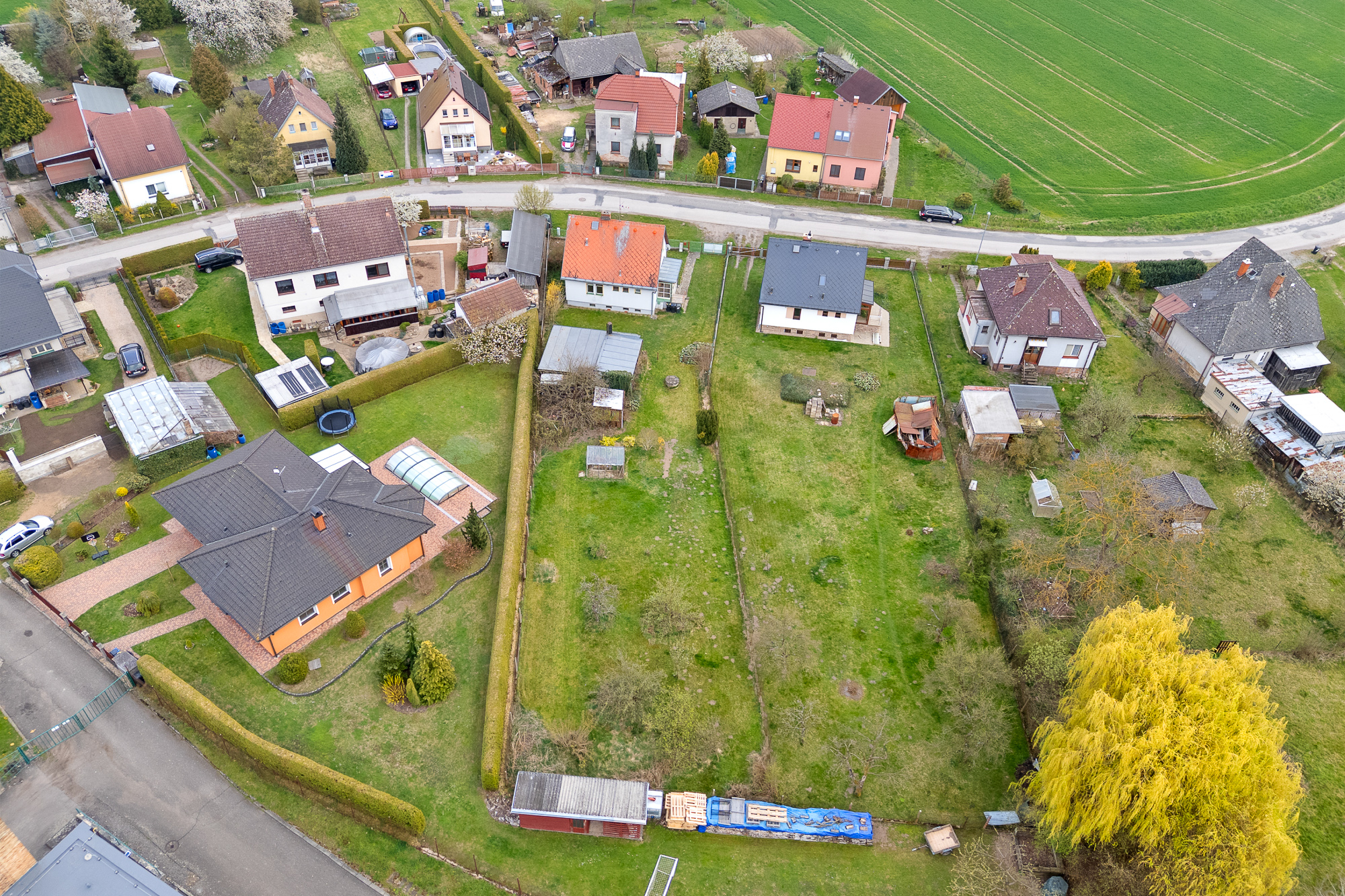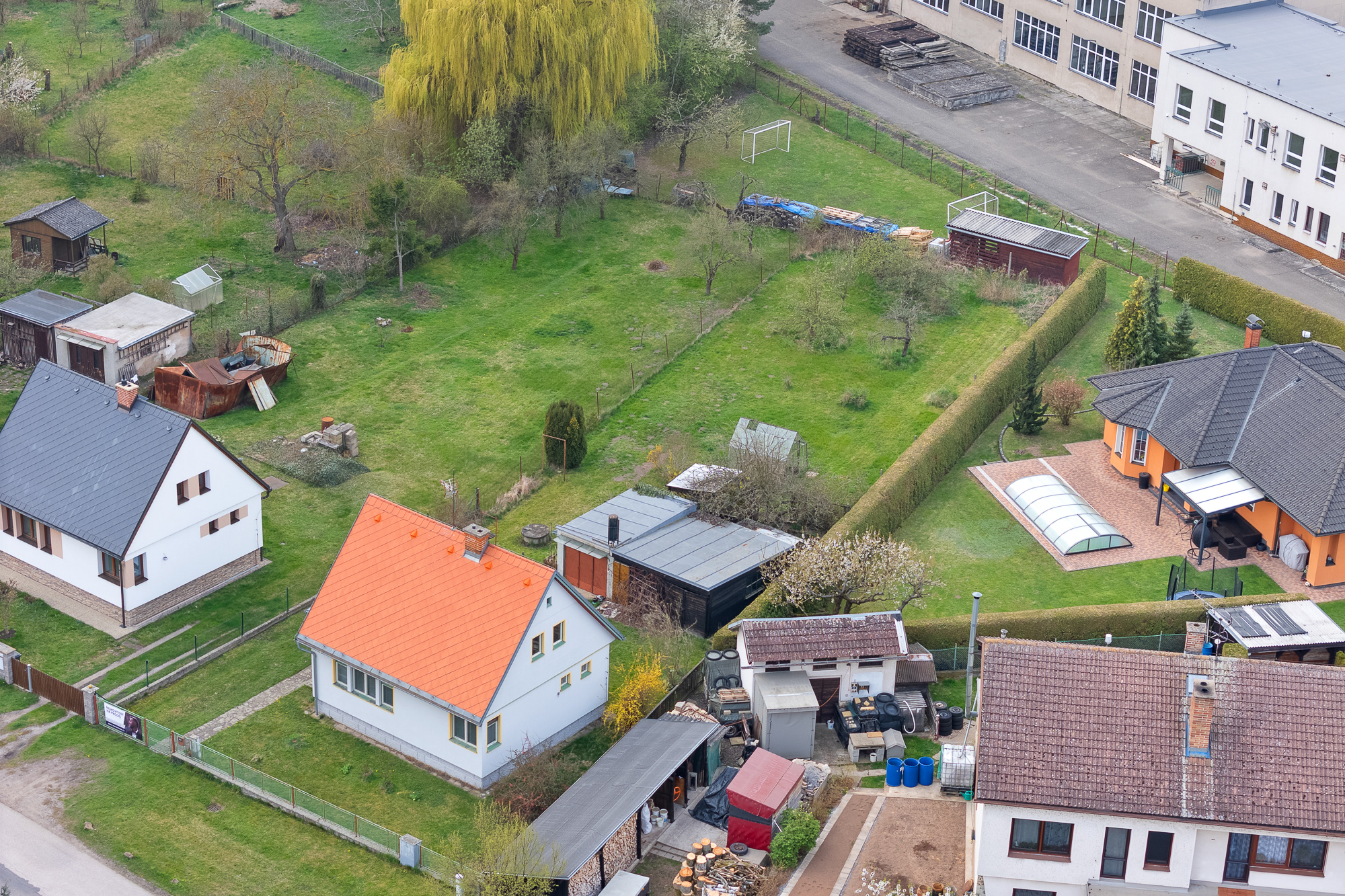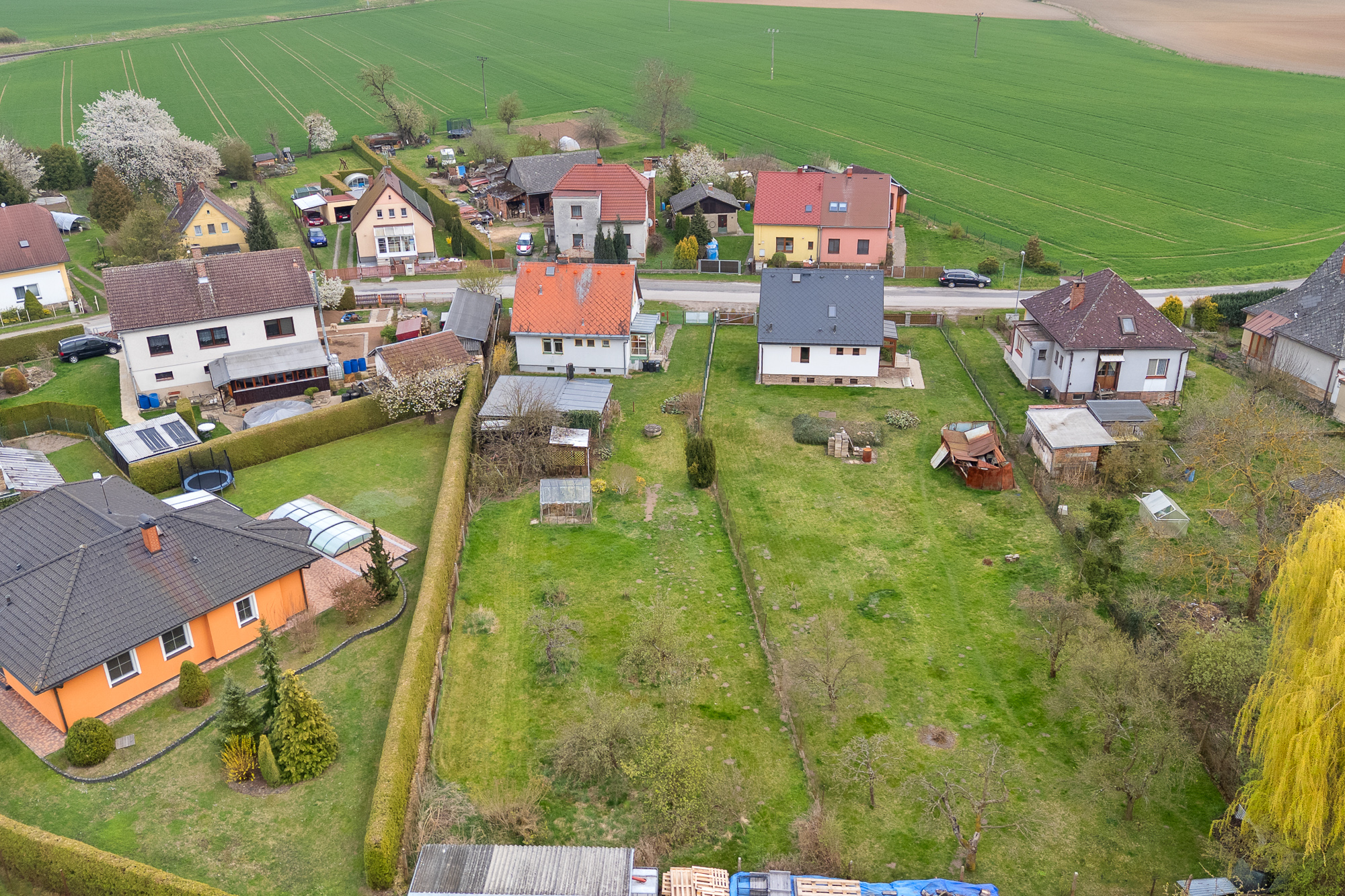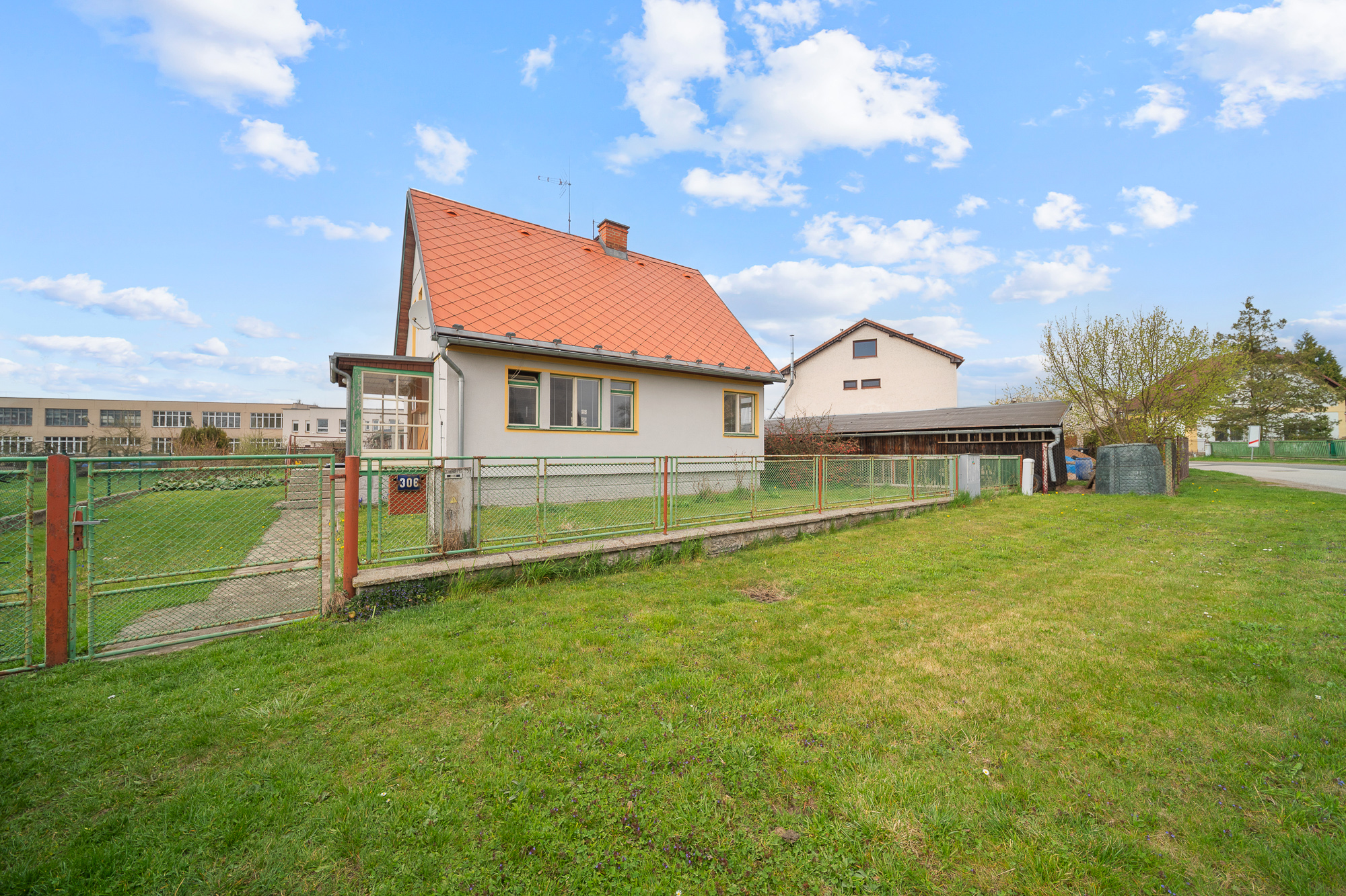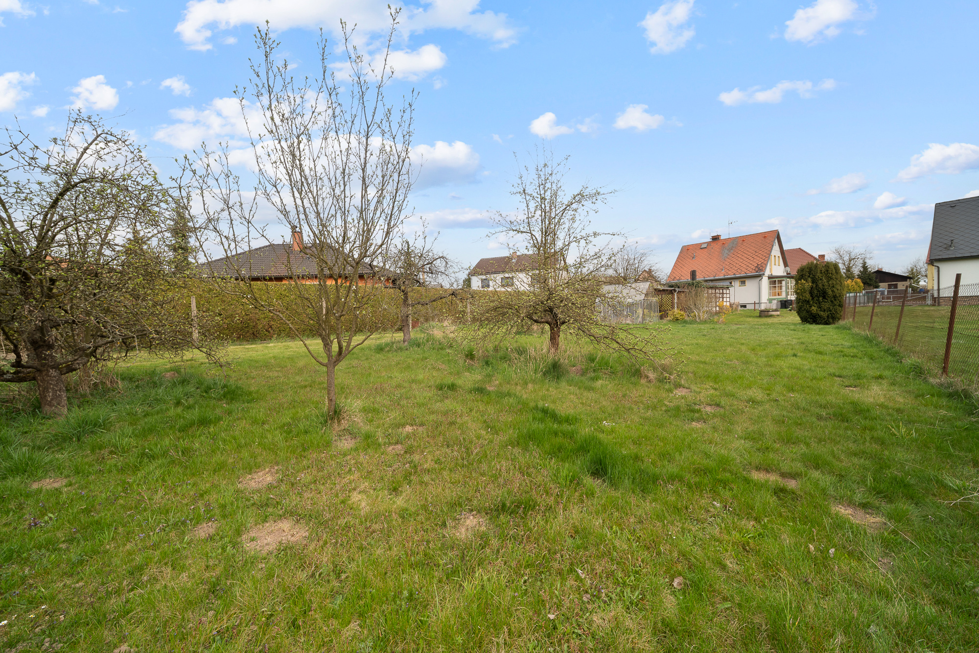Pozemek má obdélníkový tvar, je oplocený, udržovaný a osázený ovocnými stromy. Najdete zde také skleník, zděnou garáž, kůlnu a studnu s užitkovou vodou vhodnou k zalévání.