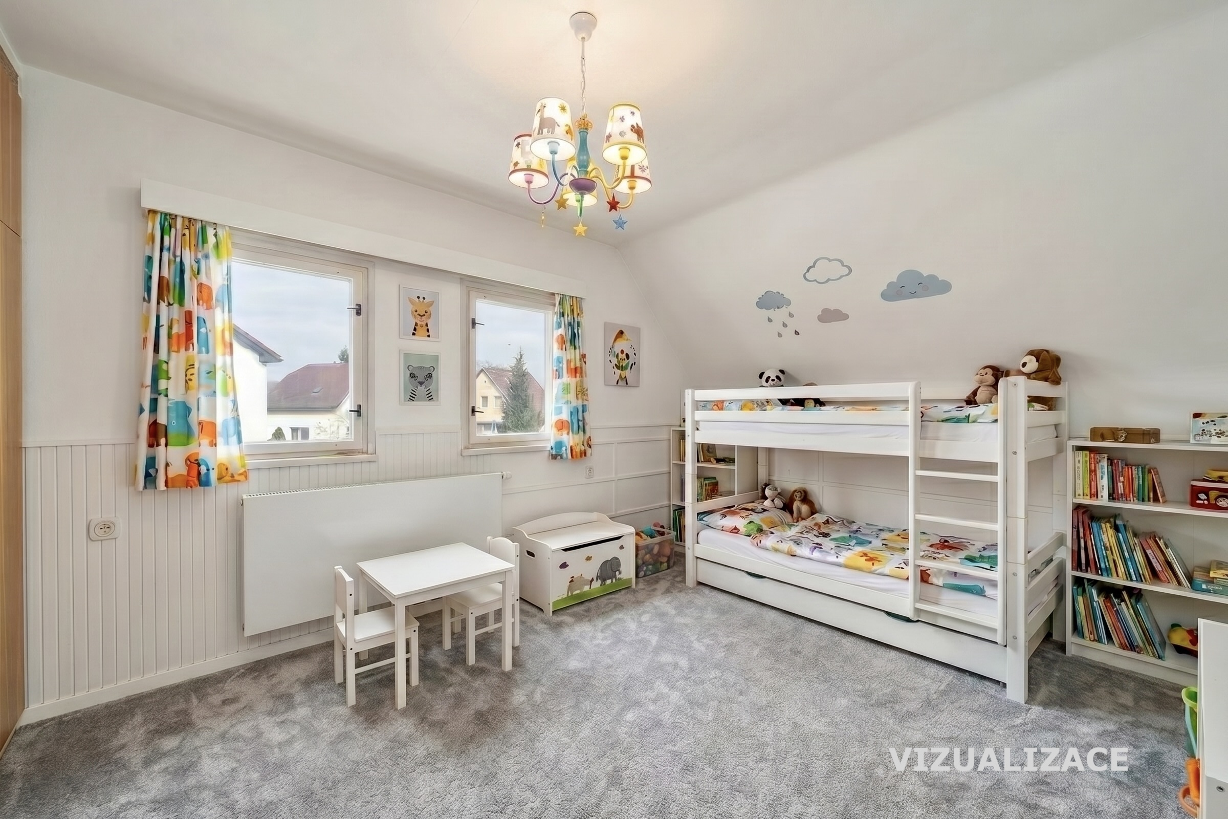 Ve zvýšeném přízemí najdete prosklenou verandu, chodbu, obývací pokoj, jídelnou, kuchyň, koupelnu, samostatné WC a spíž. V podkroví jsou dva neprůchozí pokoje, chodba, půda a terasa nad verandou.