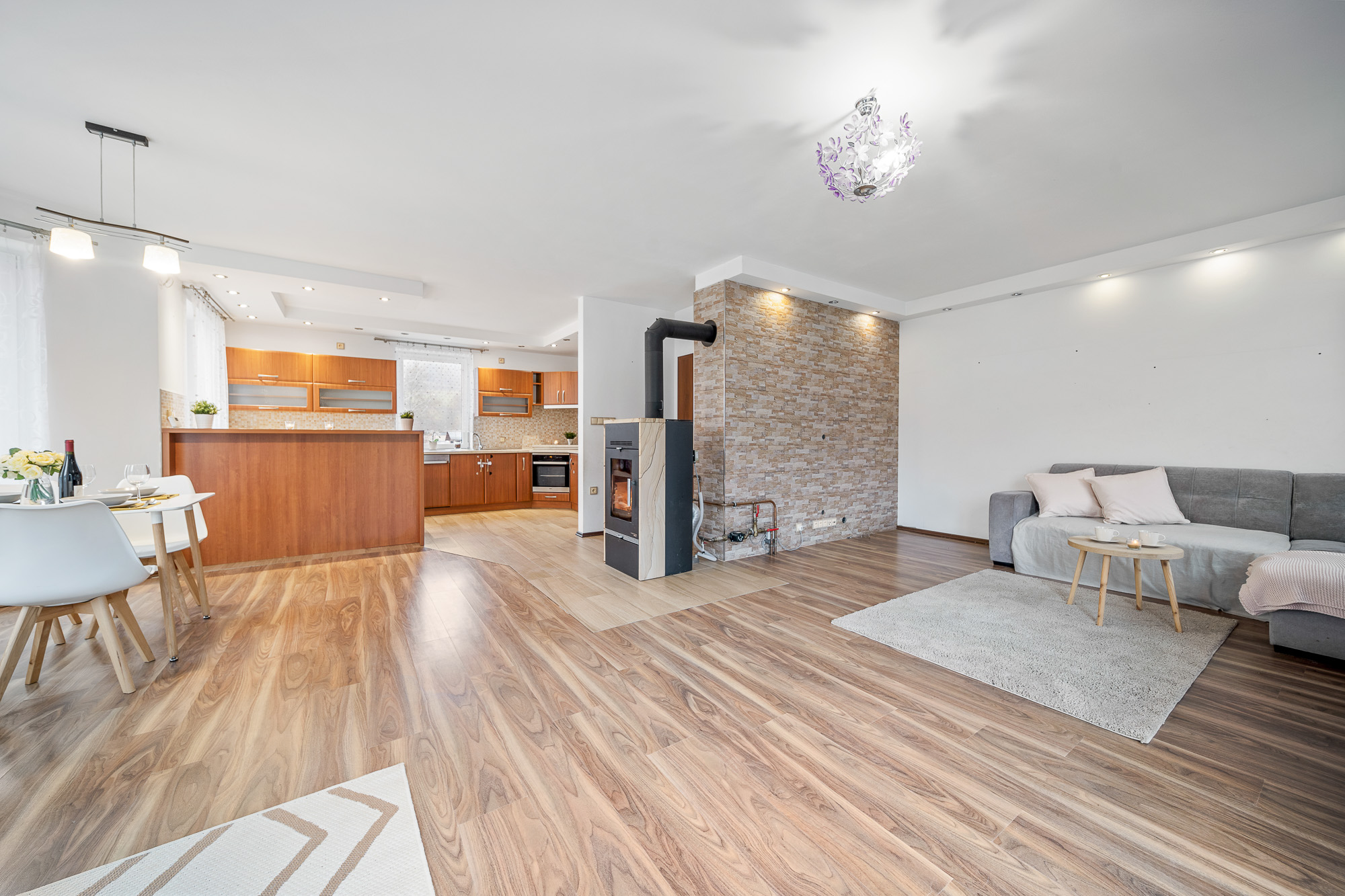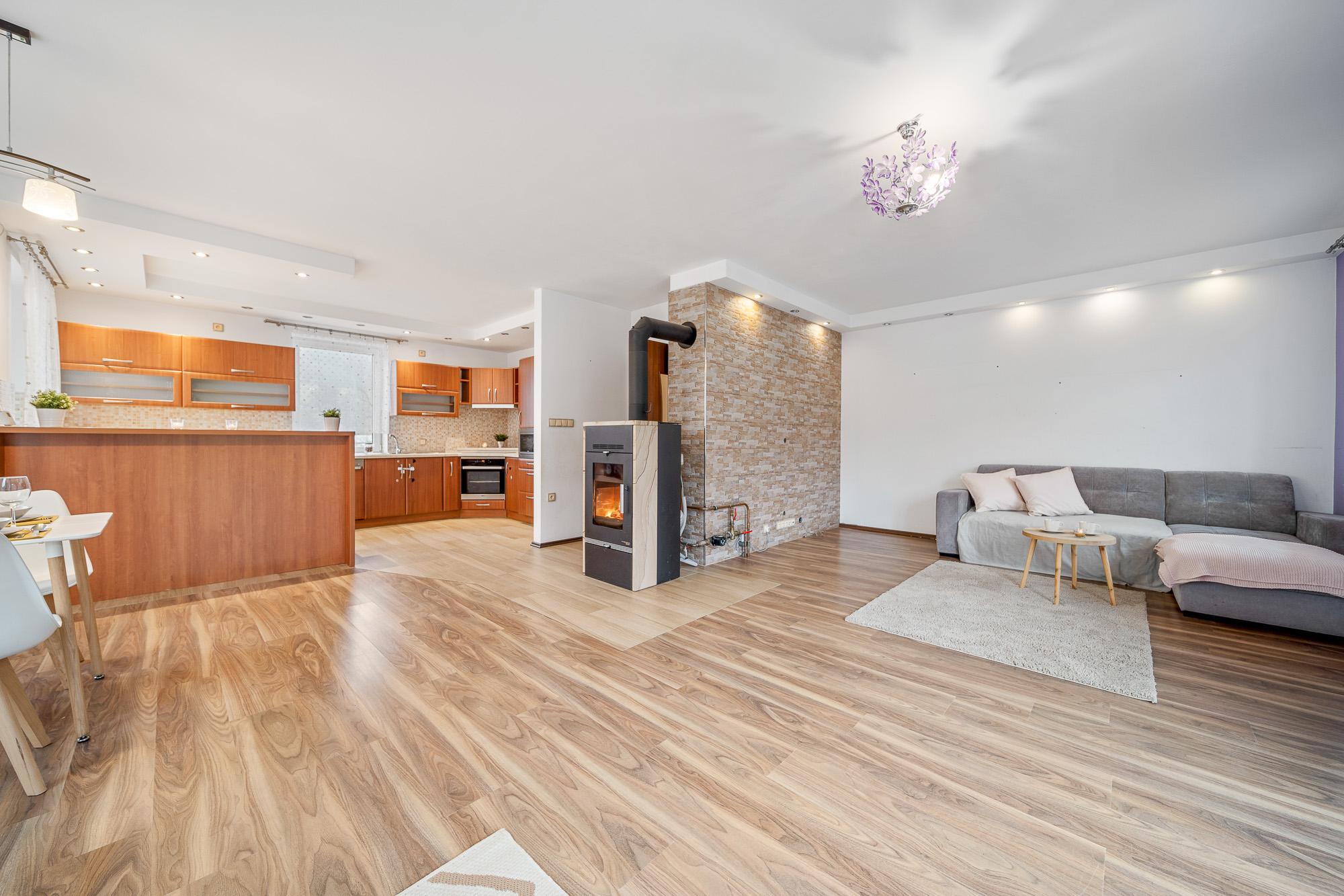 O vytápění i ohřev vody se stará plynový kondenzační kotel. Příjemnou atmosféru v zimních měsících zajistí krbová kamna s výměníkem. V celém domě je příprava pro zabezpečovací systém.