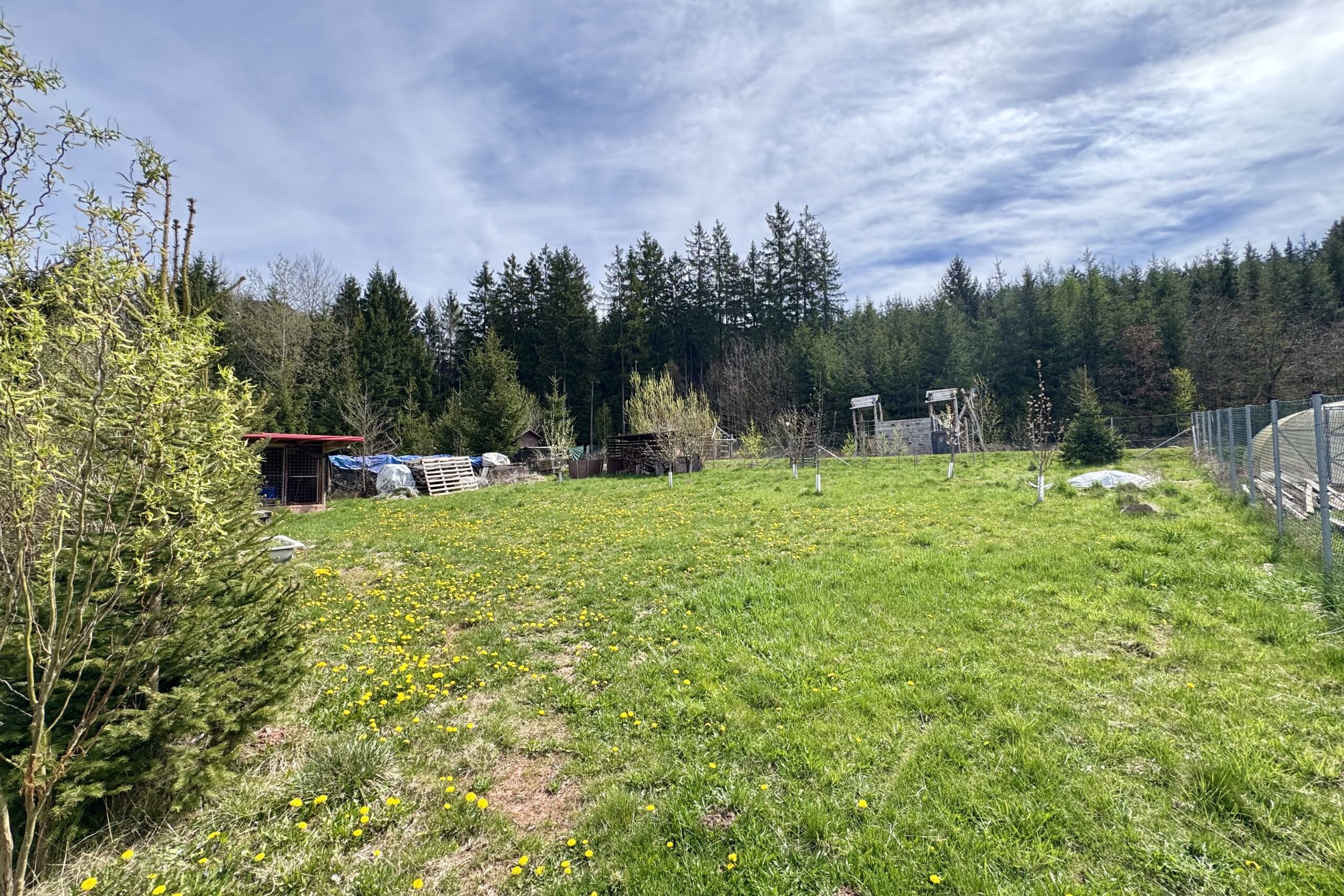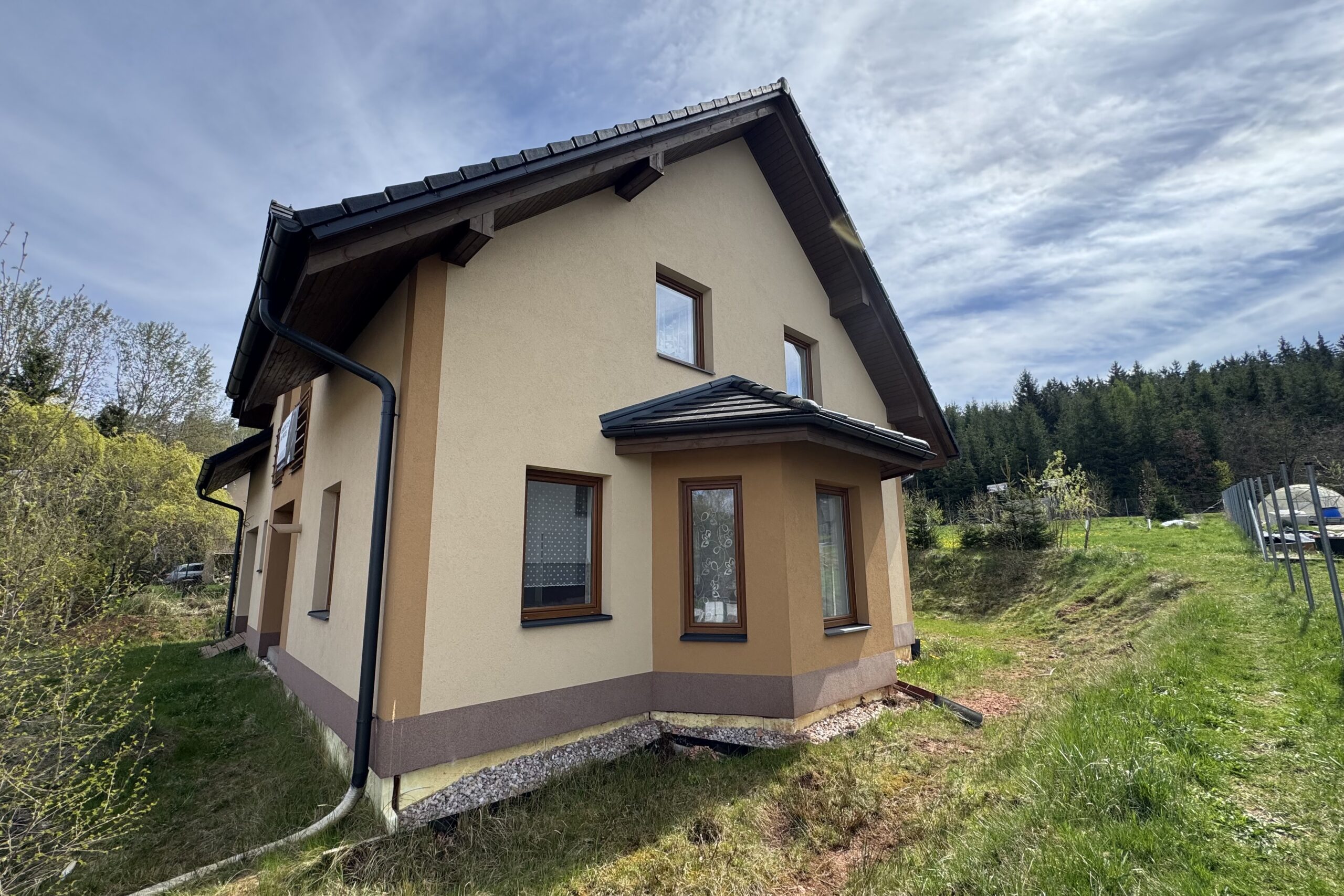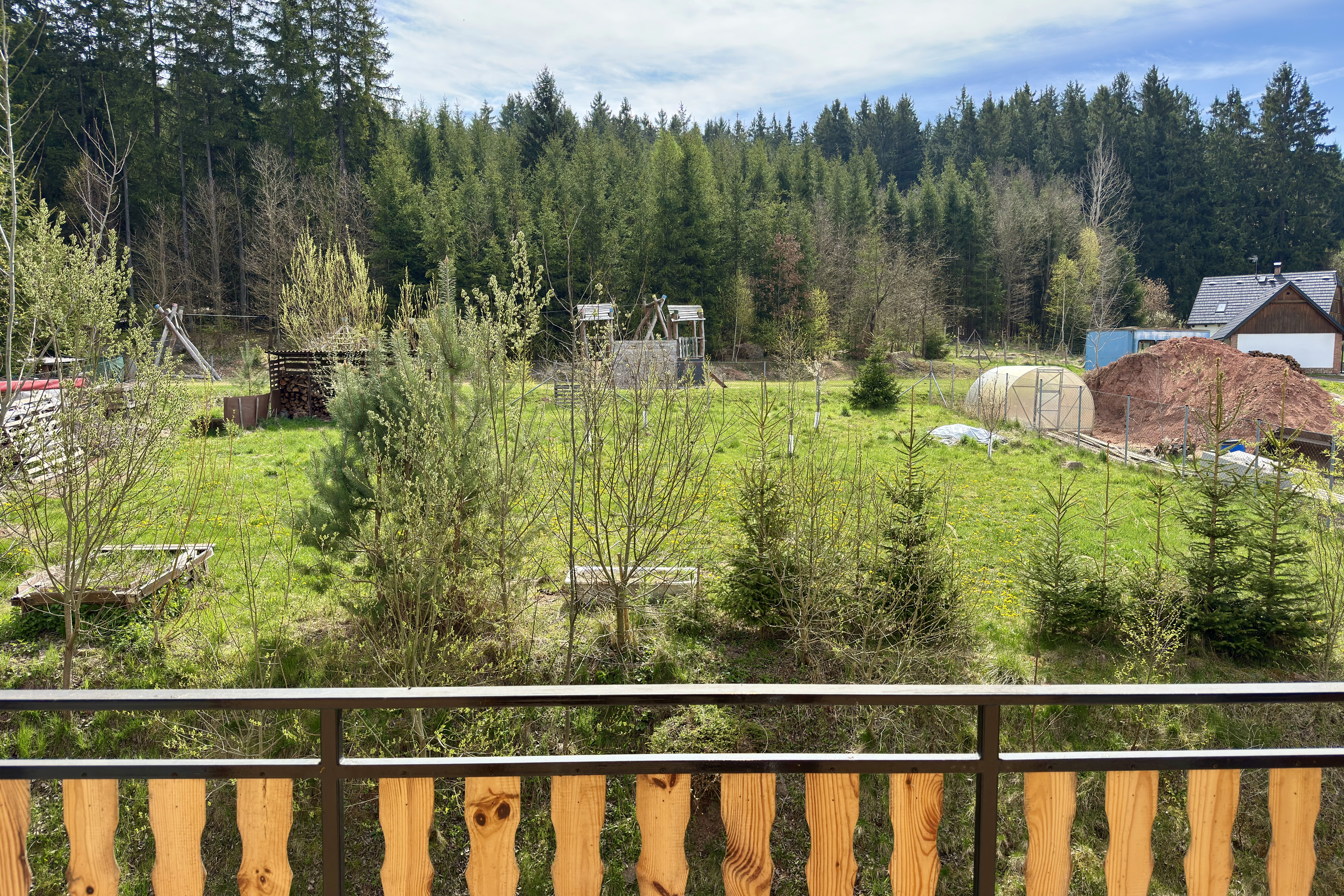 Na zahradě jsou plodící ovocné stromy a hned za pozemkem se nachází dětské hřiště. Jen pár metrů od domu začíná les, kam si můžete vyrazit na procházku.
