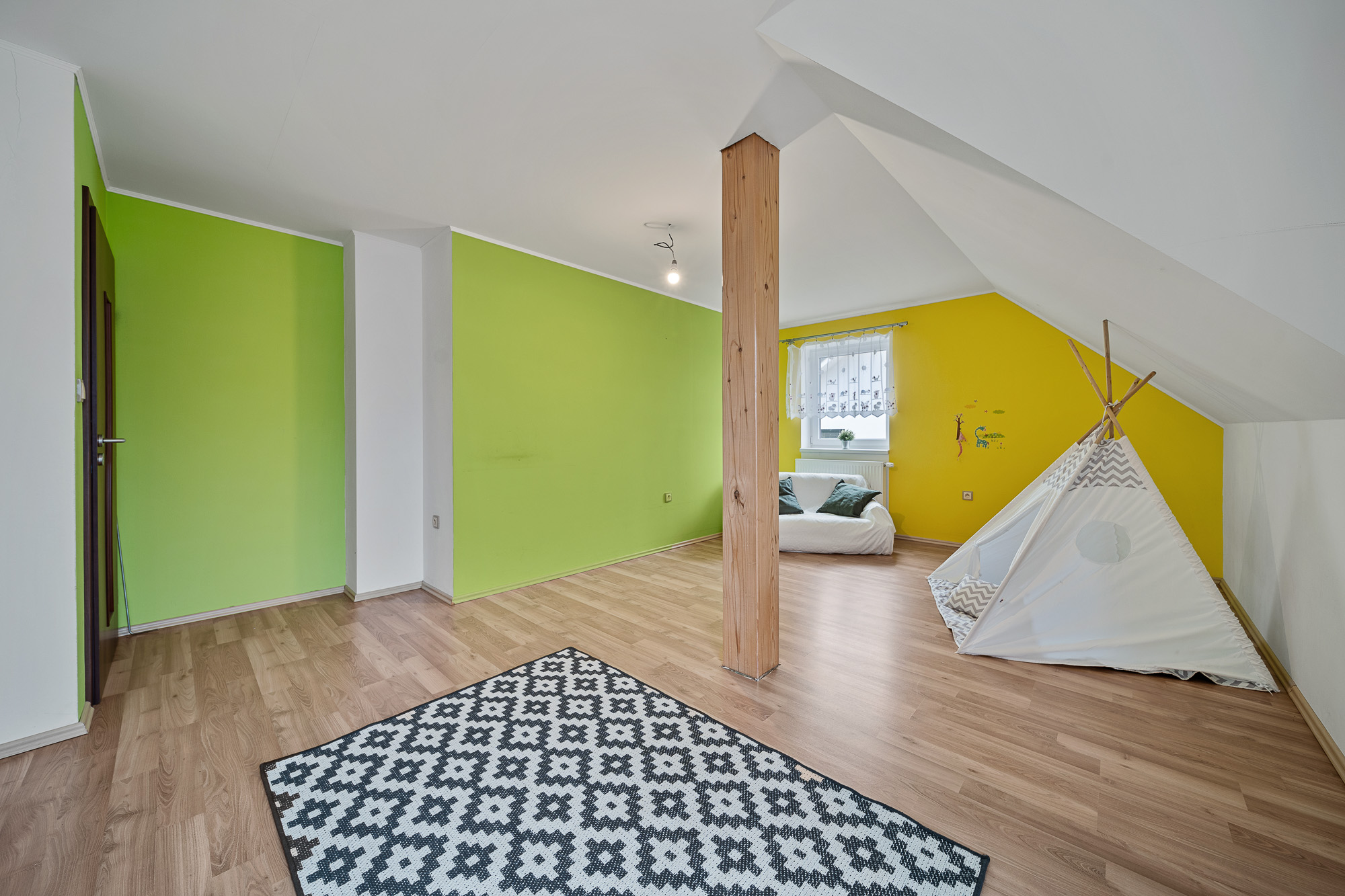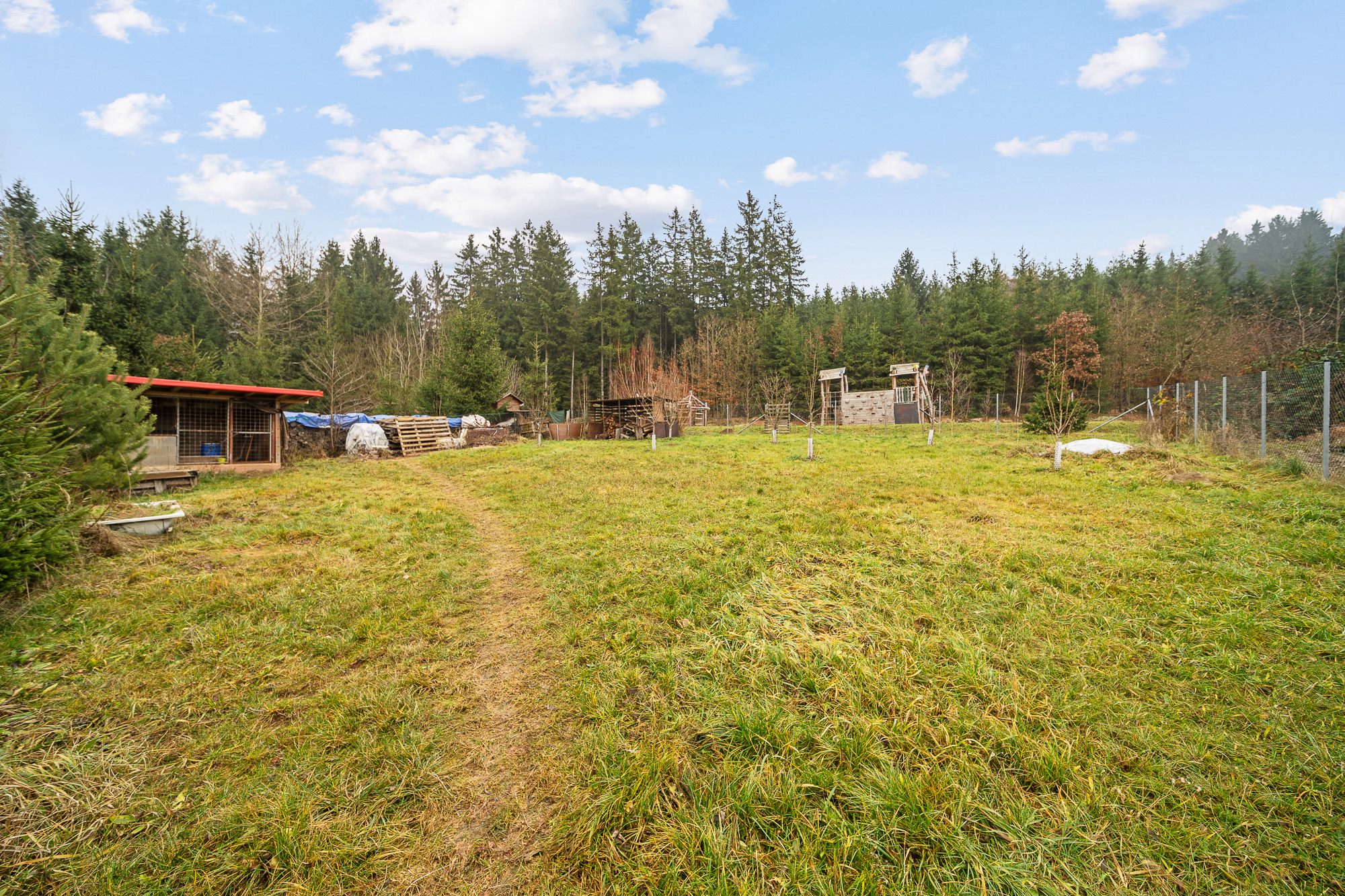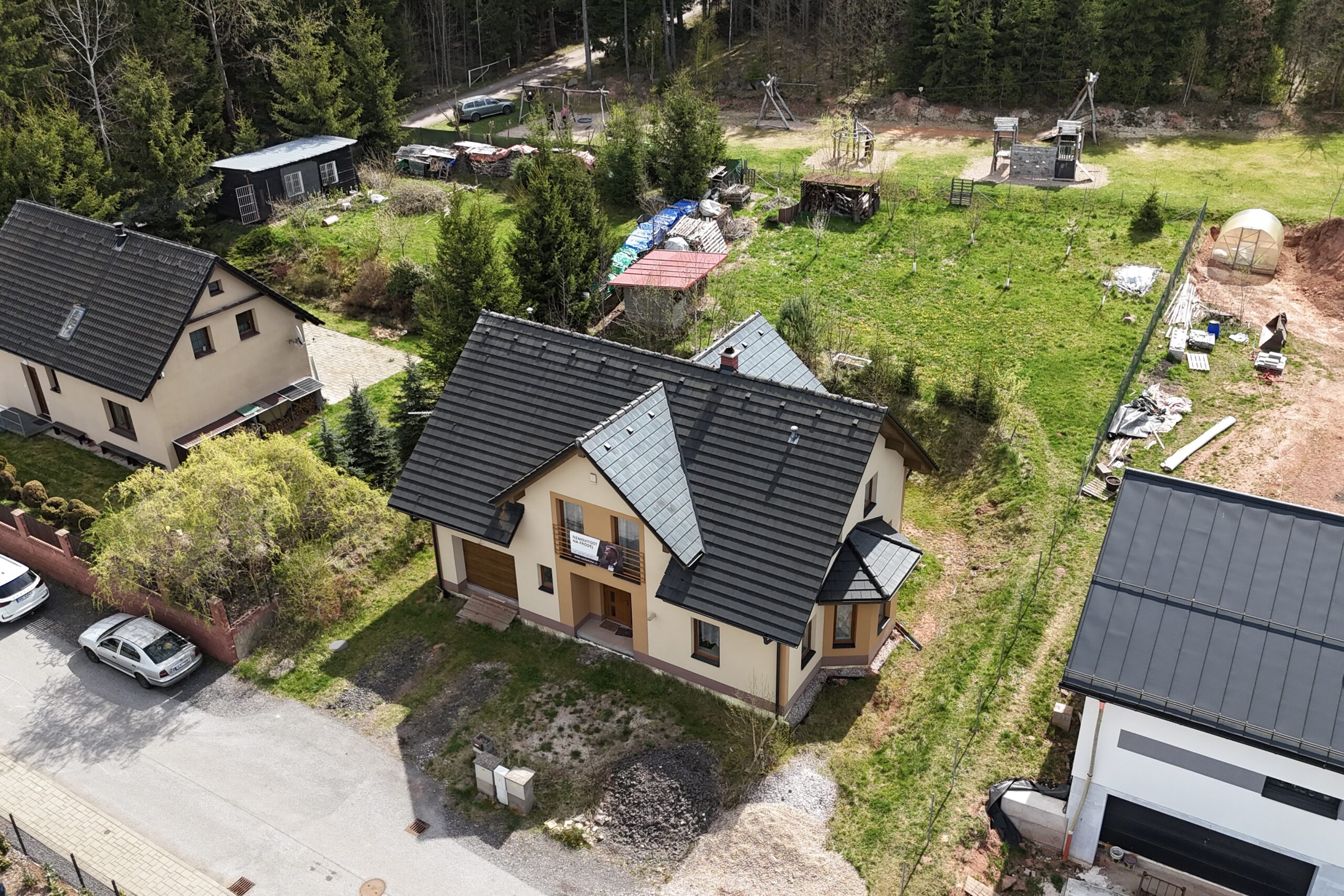 Na zahradě jsou plodící ovocné stromy a hned za pozemkem se nachází dětské hřiště. Jen pár metrů od domu začíná les, kam si můžete vyrazit na procházku.