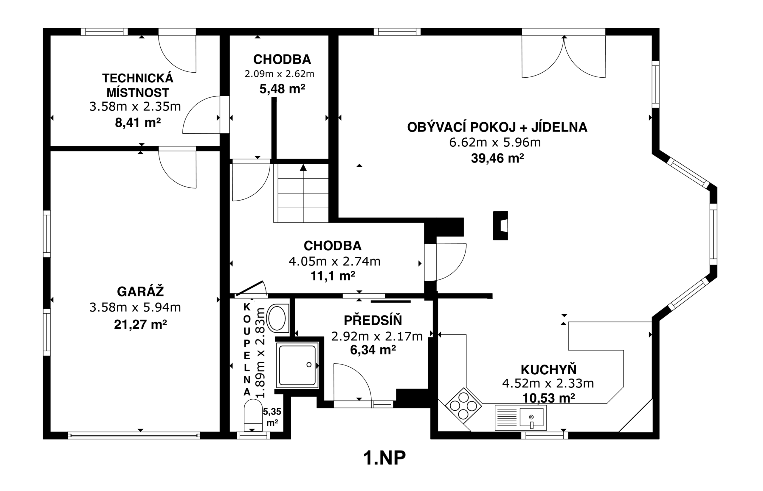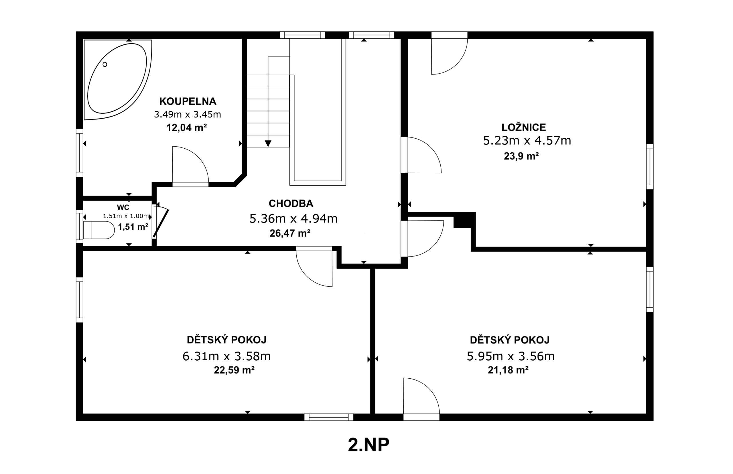 | koupelna 1: | 5,35 m² | pokoj 2: | 21,18 m² | |