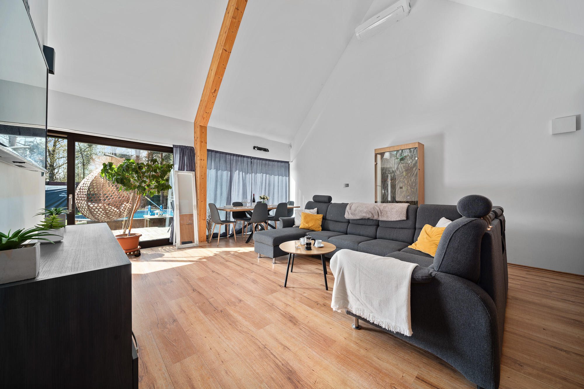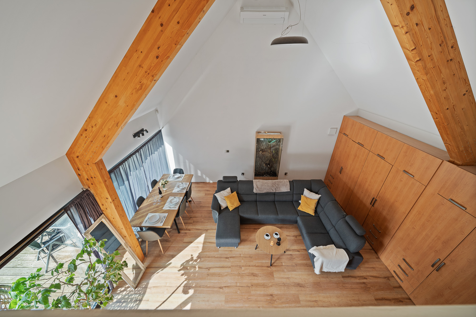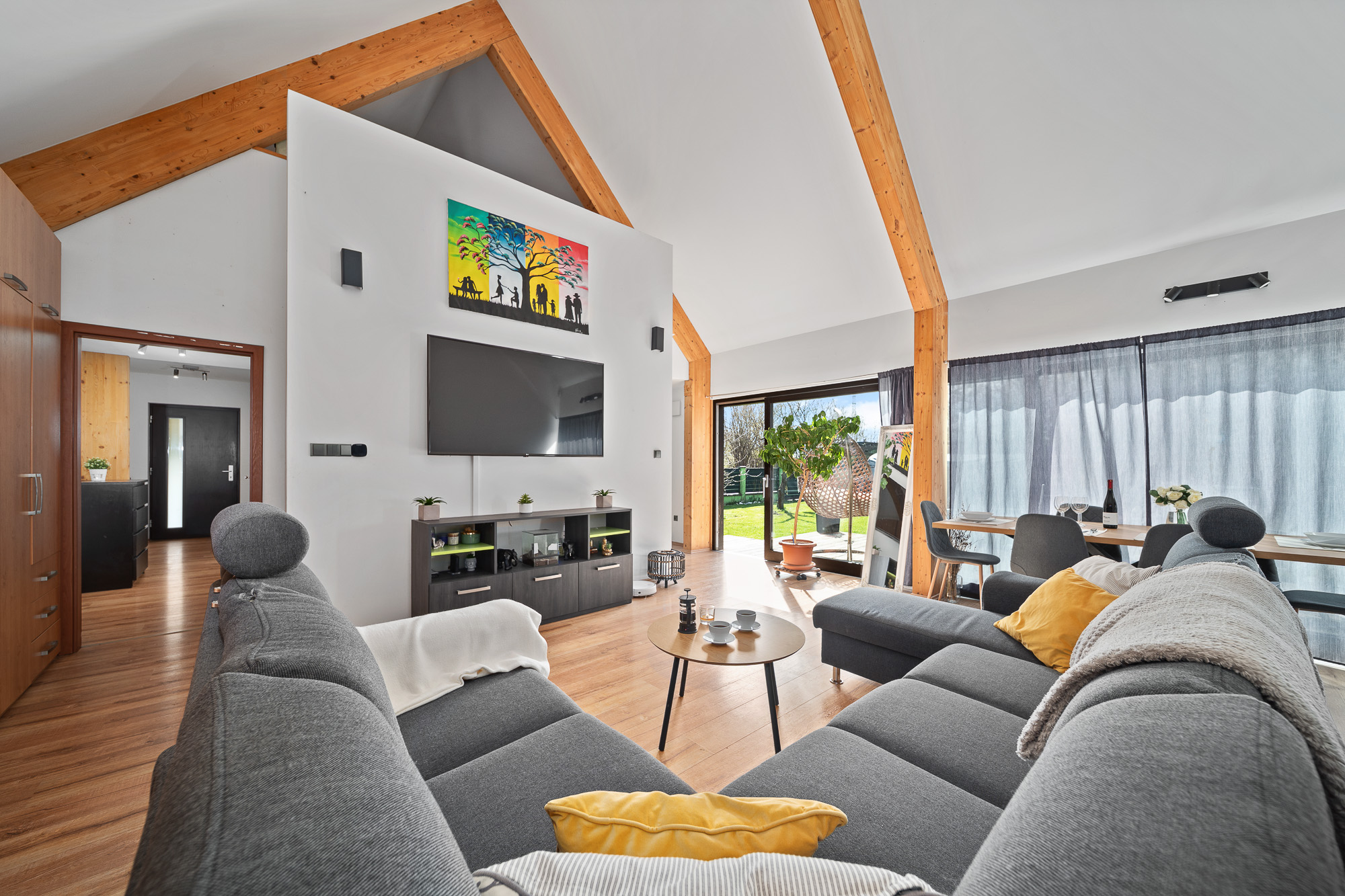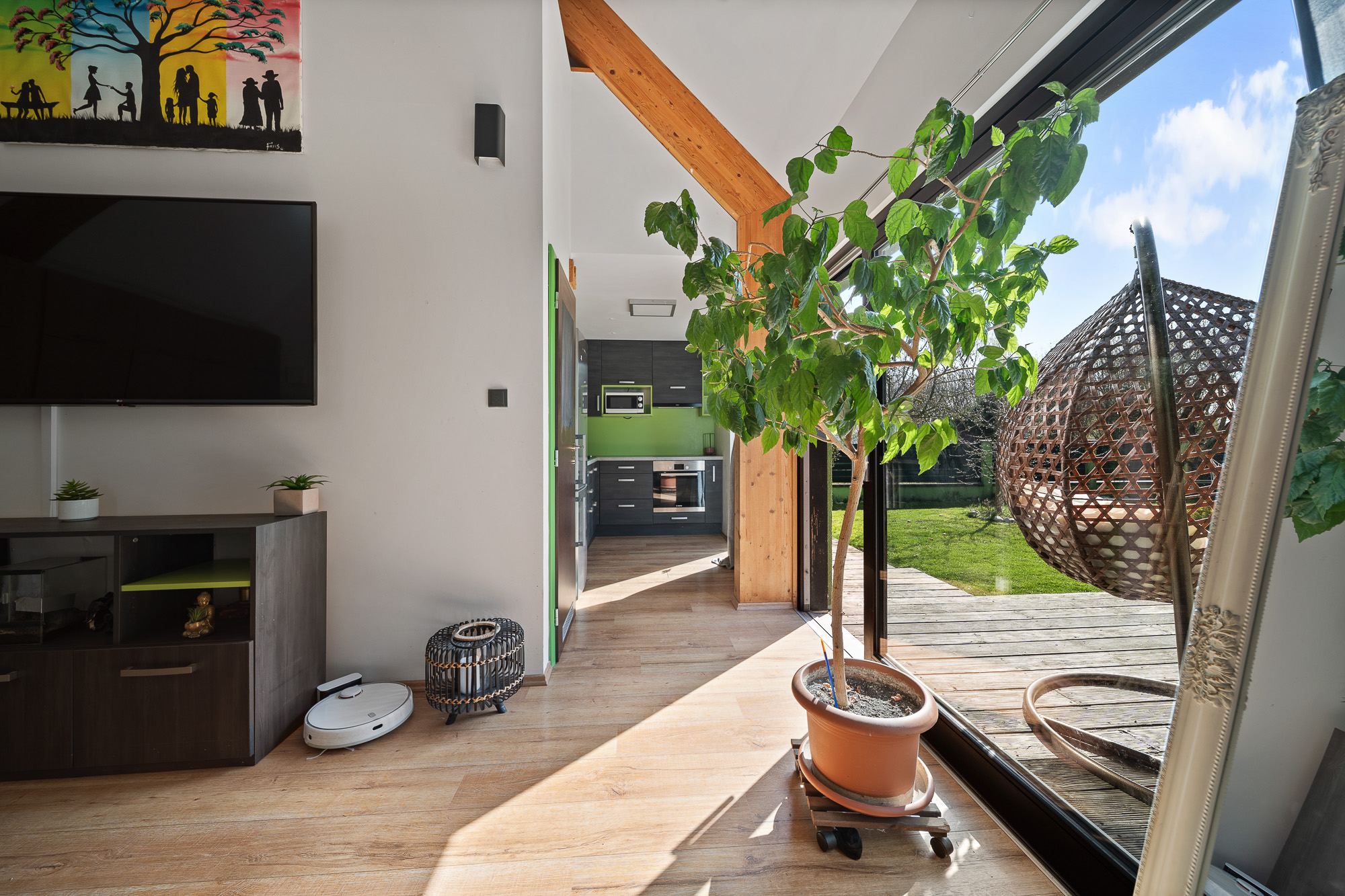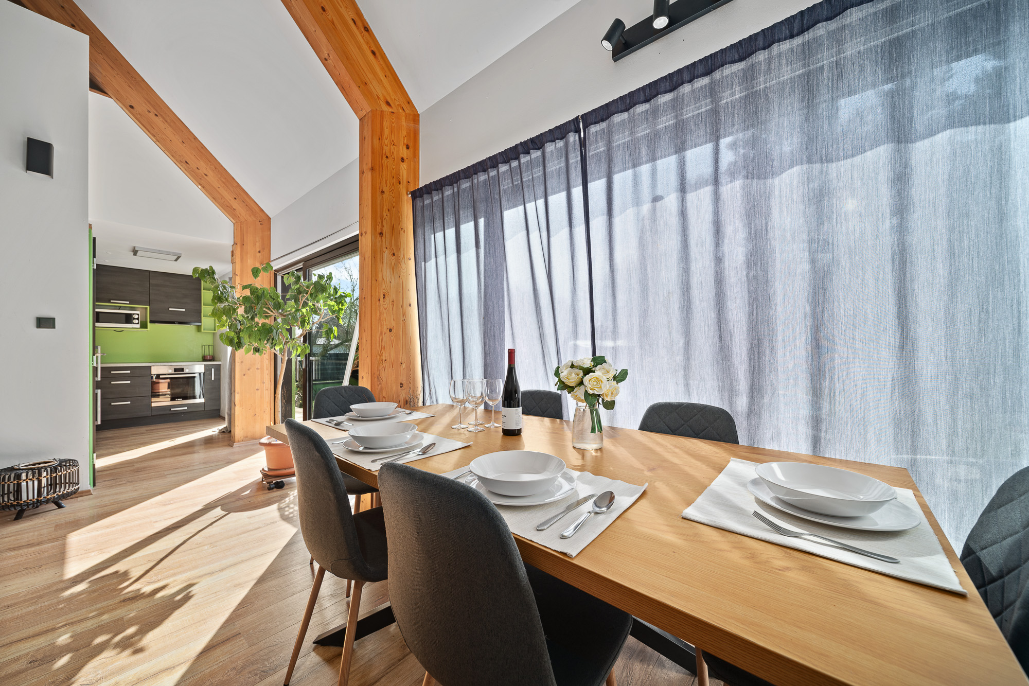 Okouzlí vás především vzdušné propojení kuchyně, jídelny a obývacího prostoru, které díky velkým posuvným dveřím s přímým vstupem na terasu, zajišťuje neustálý kontakt s okolní přírodou.