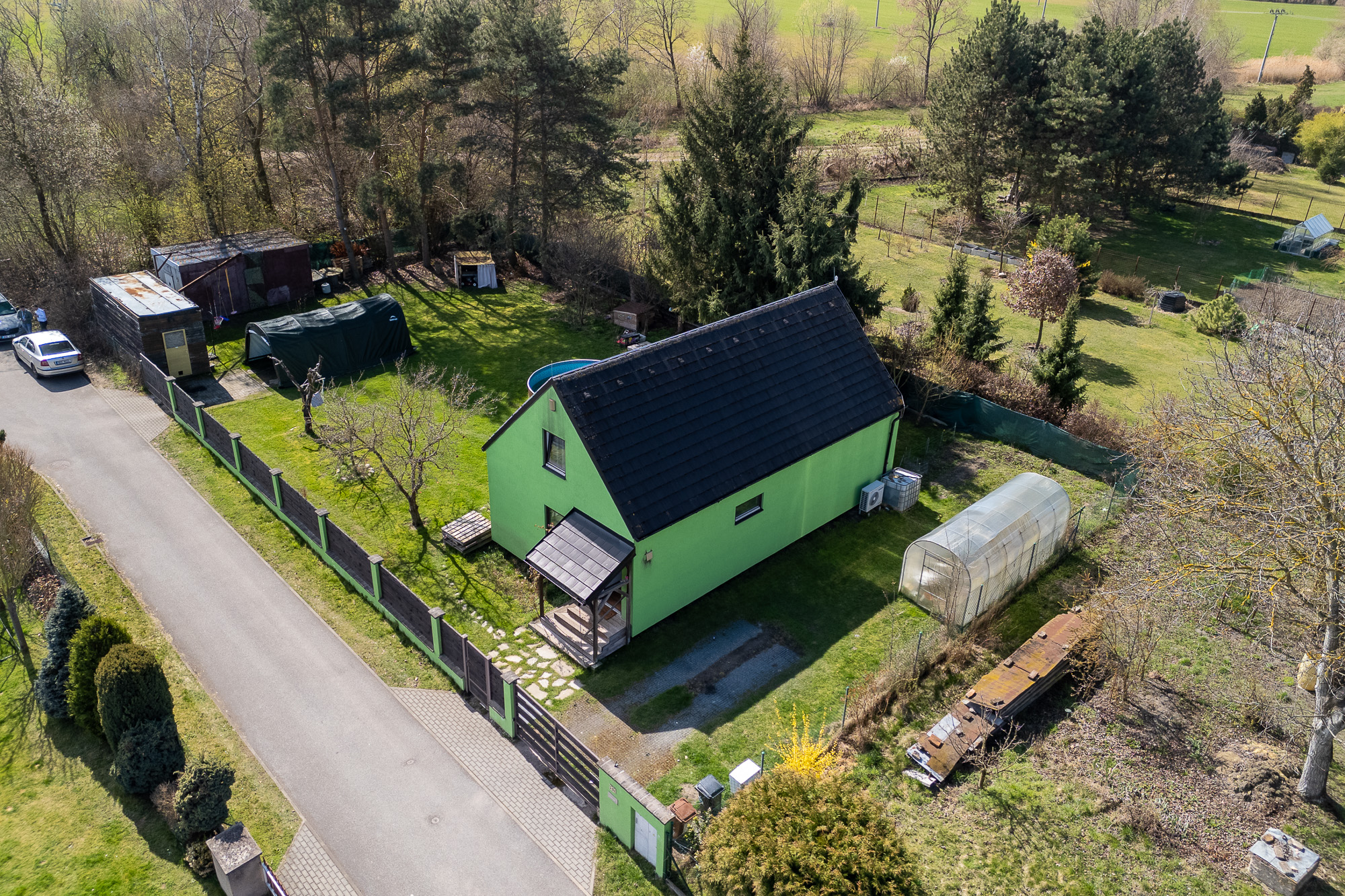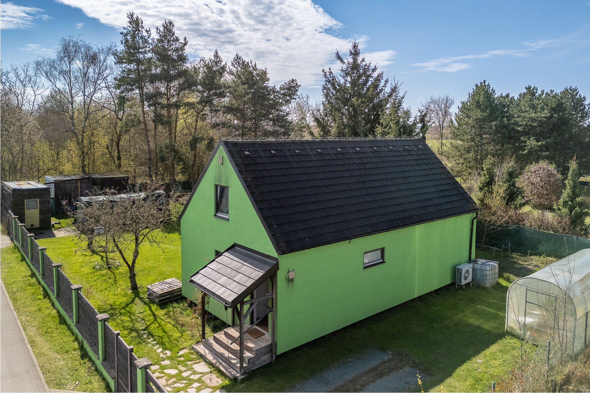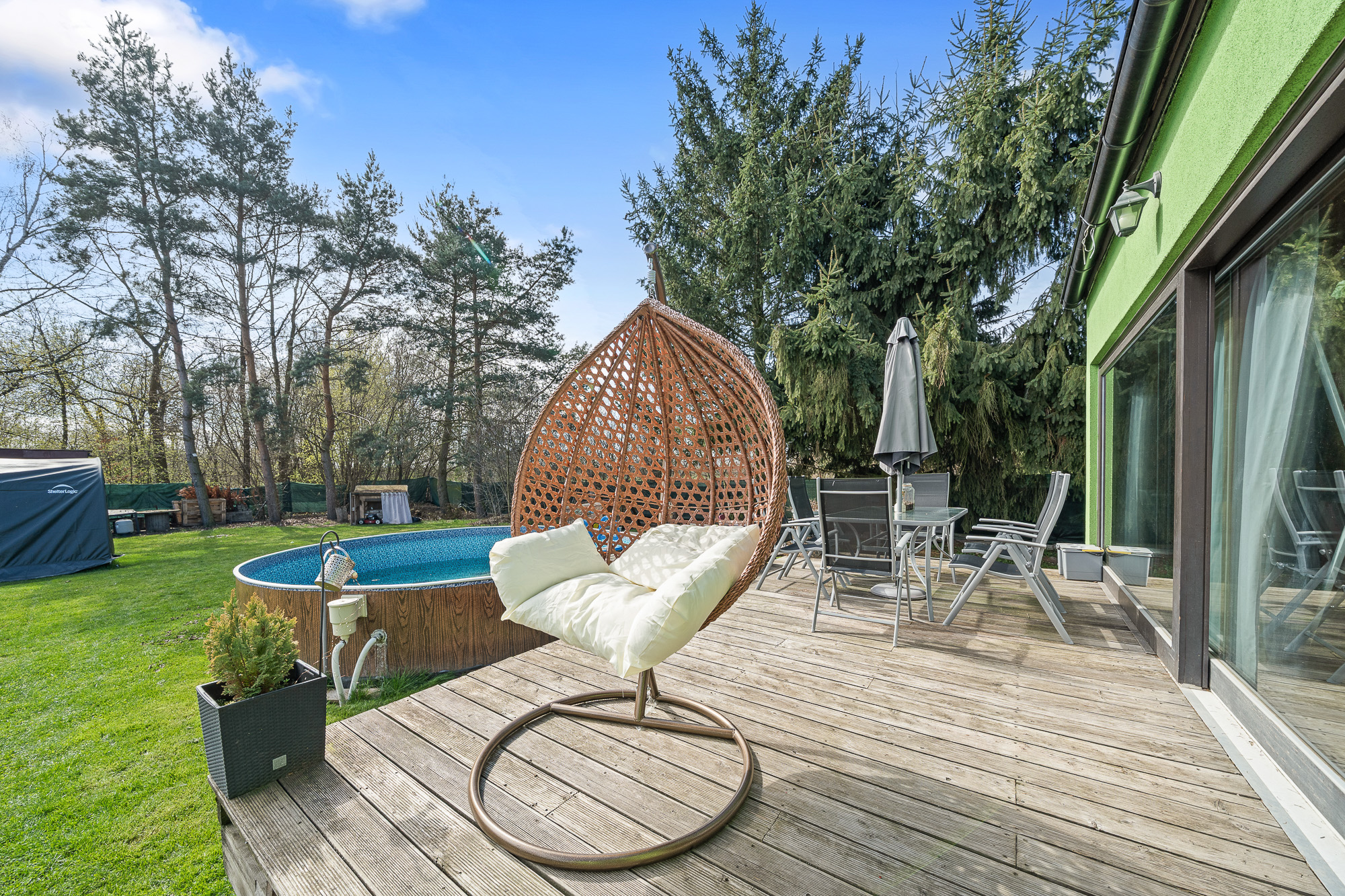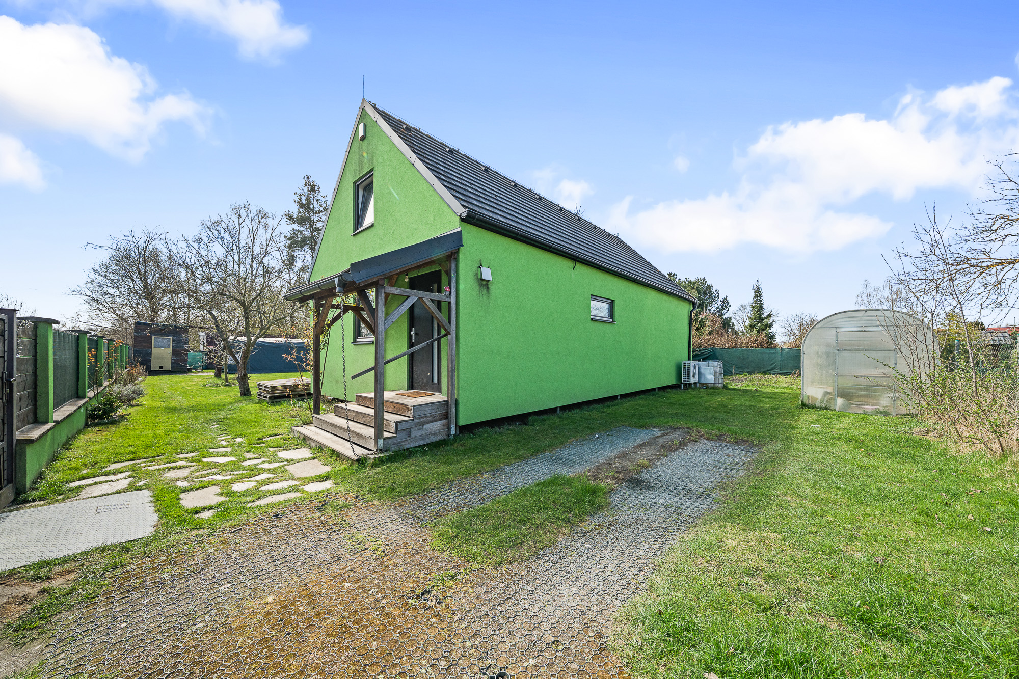 Před terasou se nachází bazén, na zahradě dále nechybí ani skleník a dvě stavební buňky, které můžete využít například jako sklad nebo dílnu.