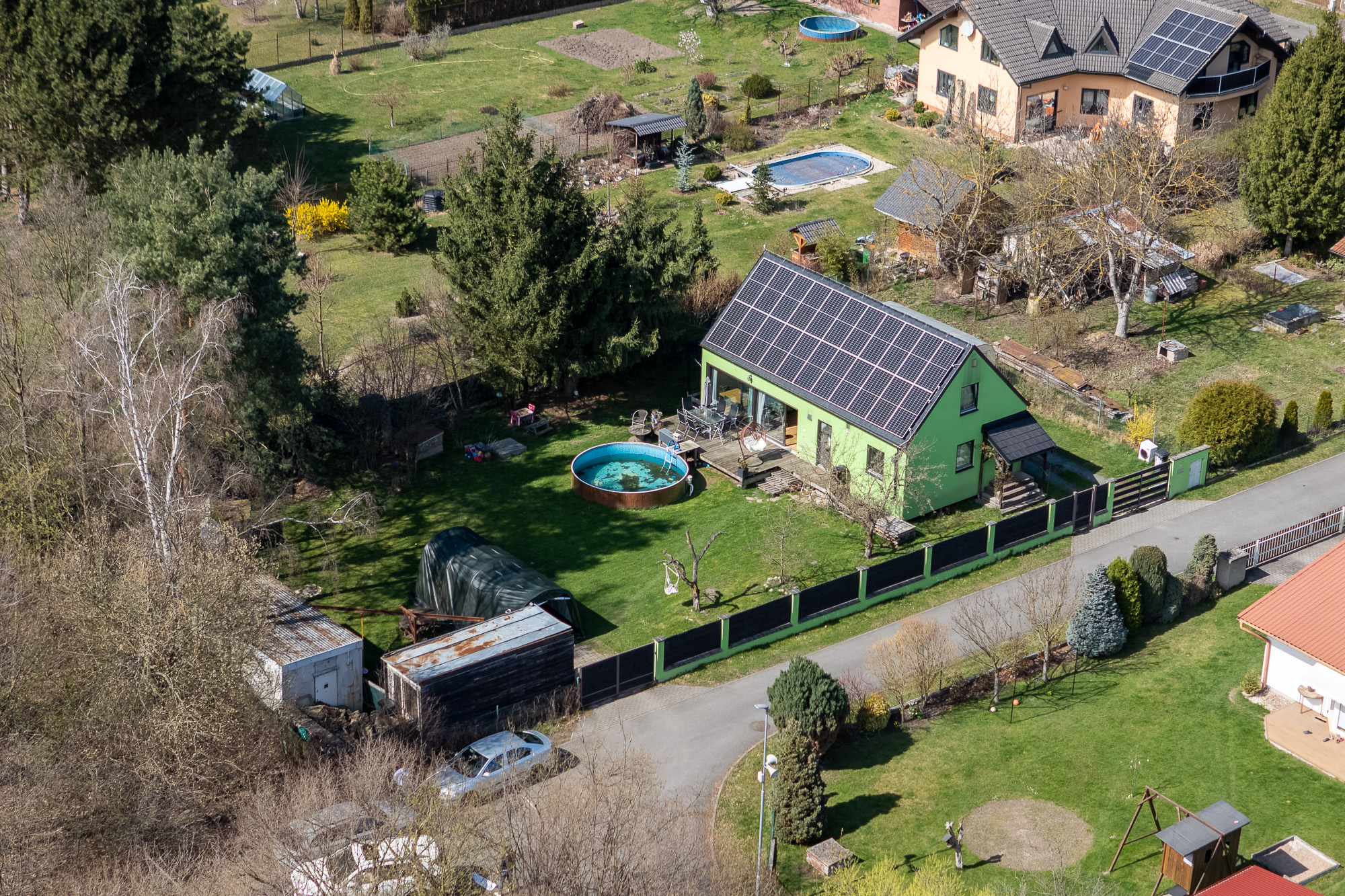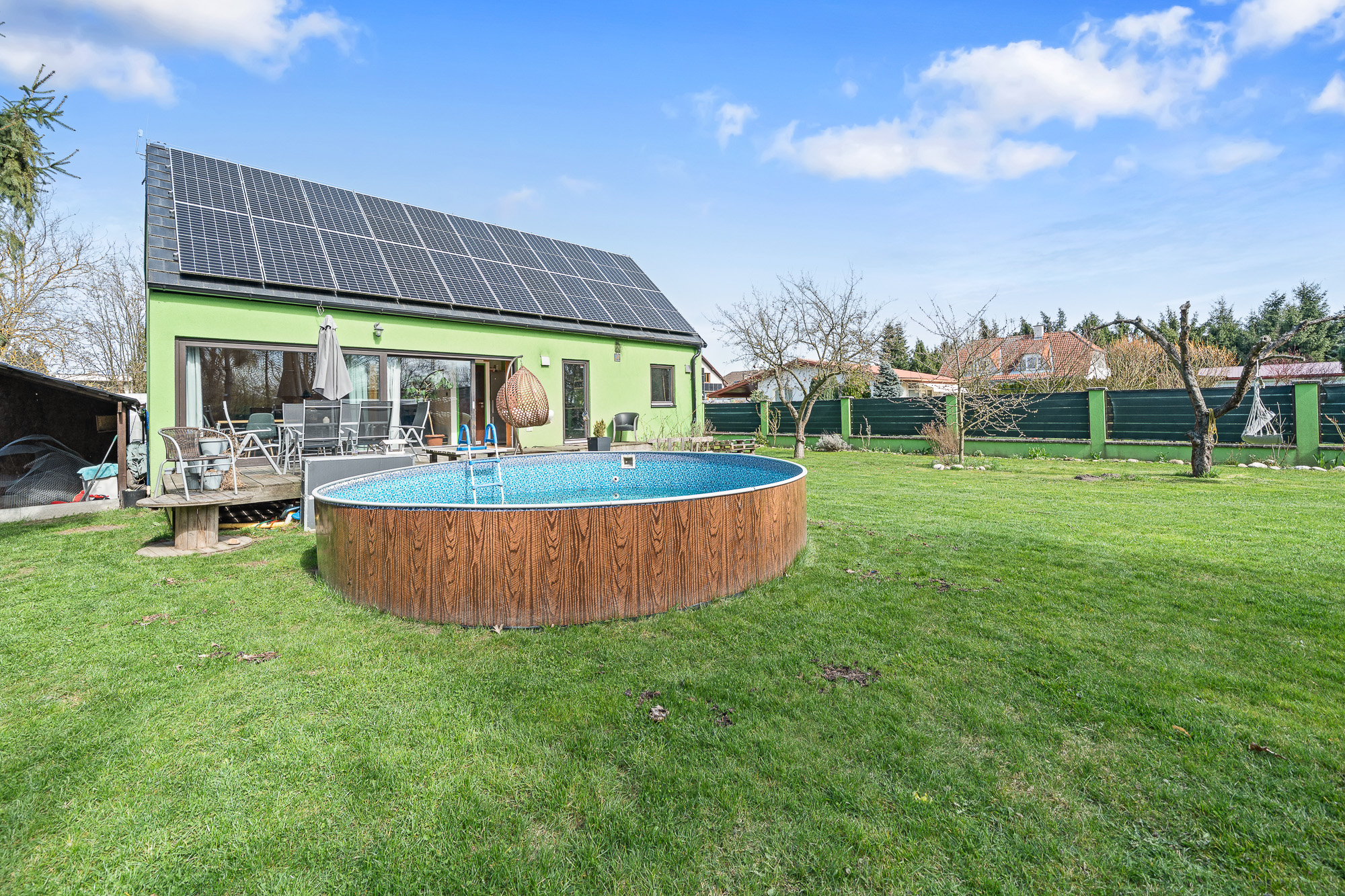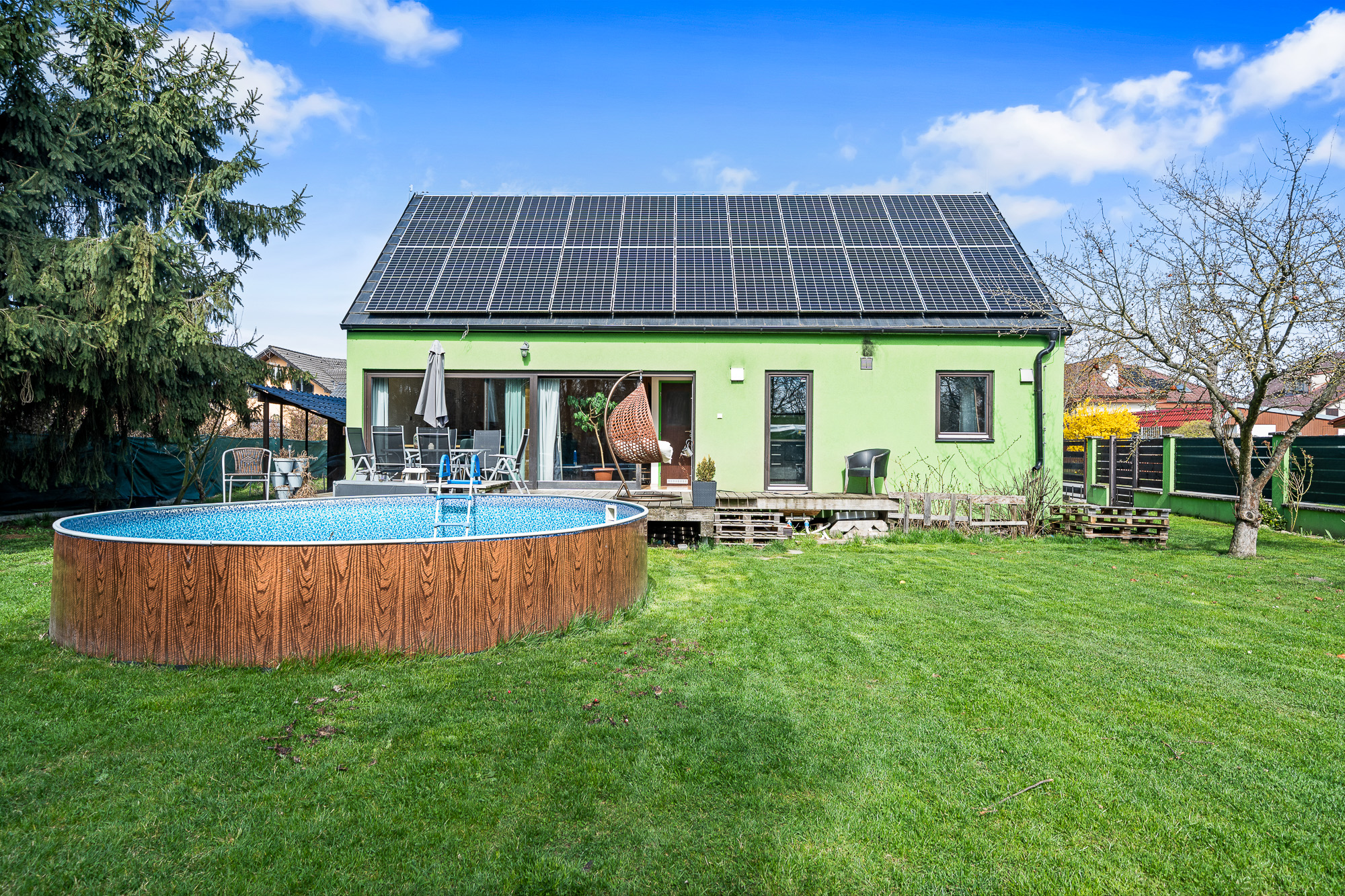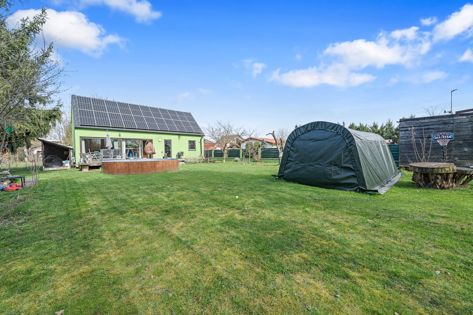Před terasou se nachází bazén, na zahradě dále nechybí ani skleník a dvě stavební buňky, které můžete využít například jako sklad nebo dílnu.