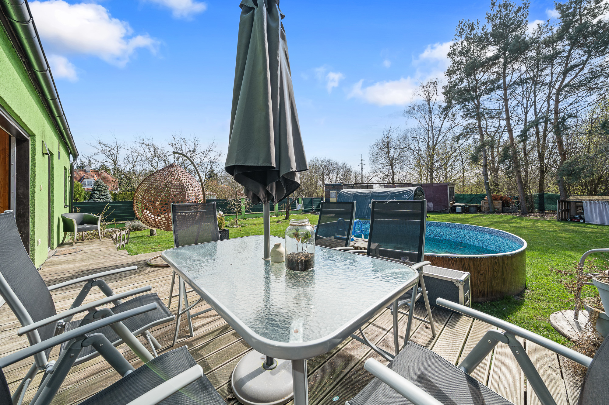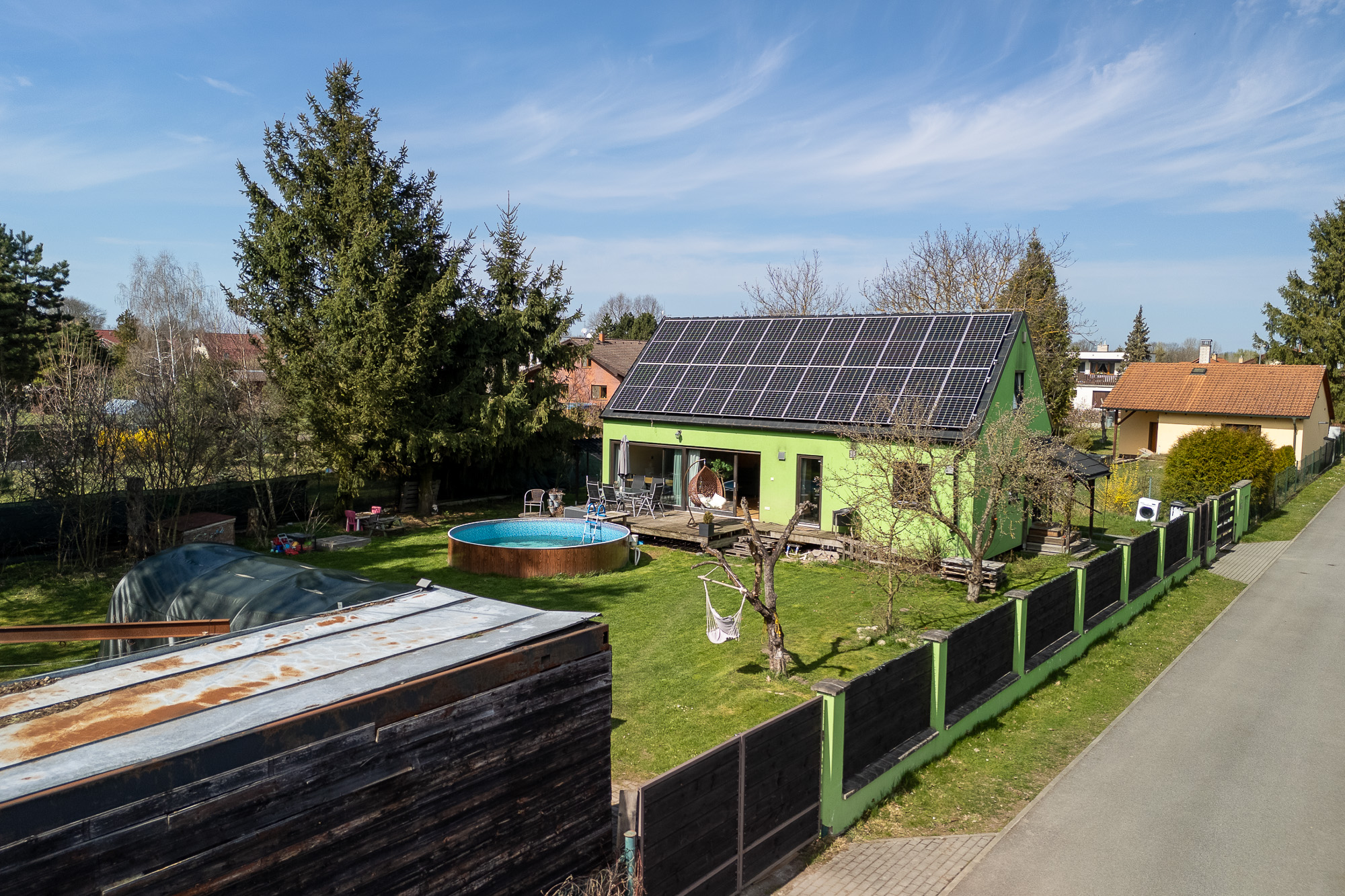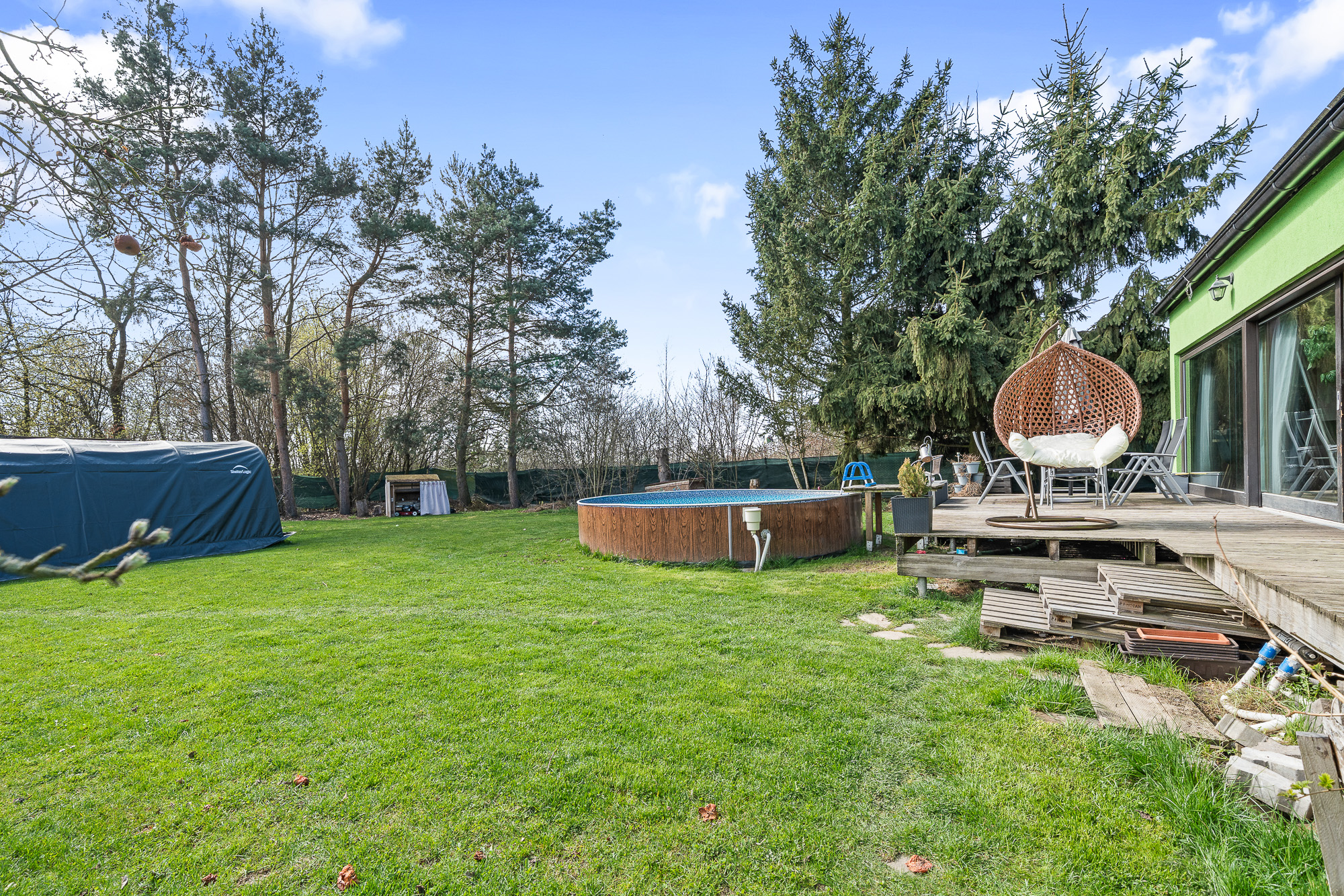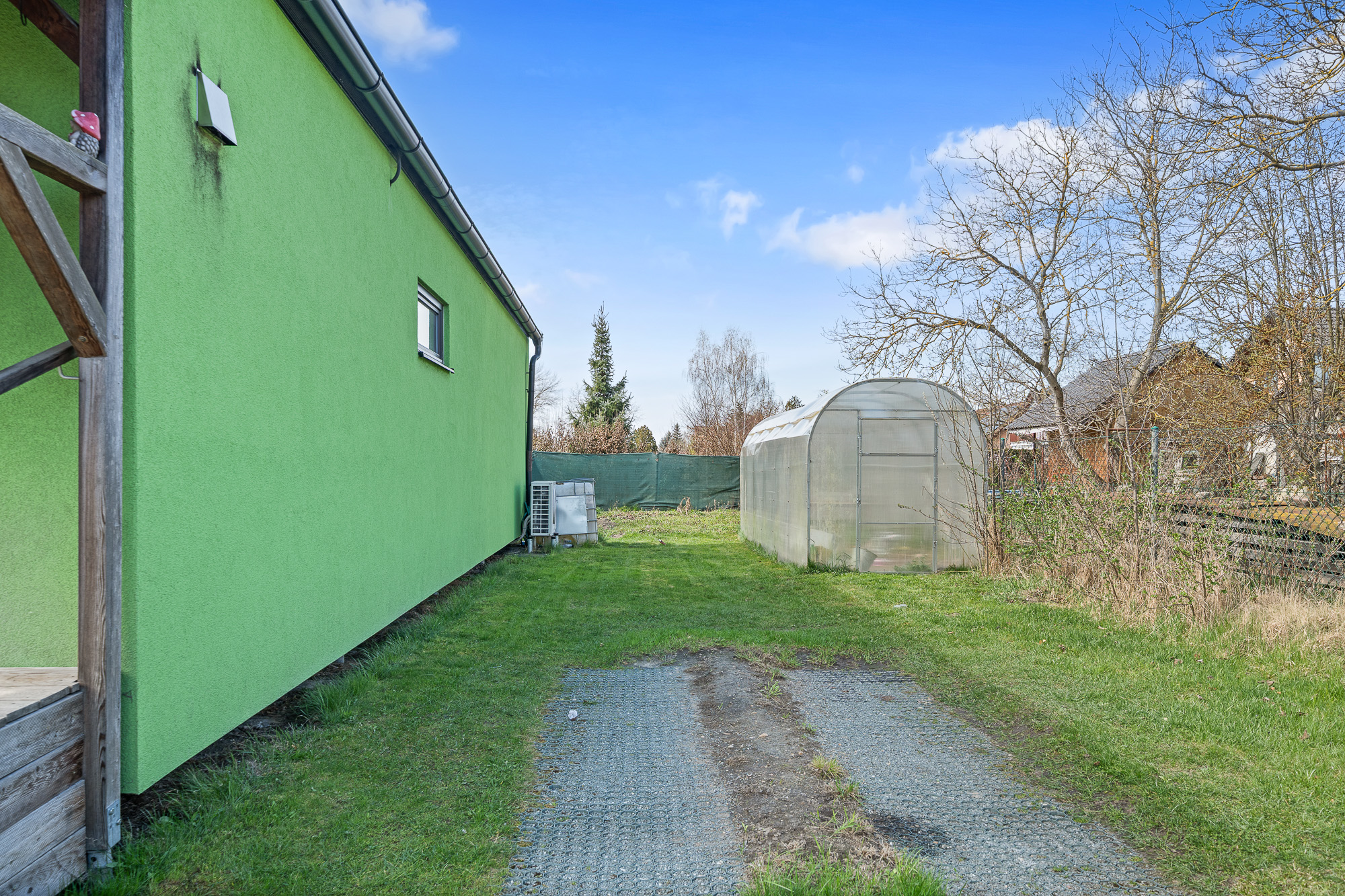 Před terasou se nachází bazén, na zahradě dále nechybí ani skleník a dvě stavební buňky, které můžete využít například jako sklad nebo dílnu.