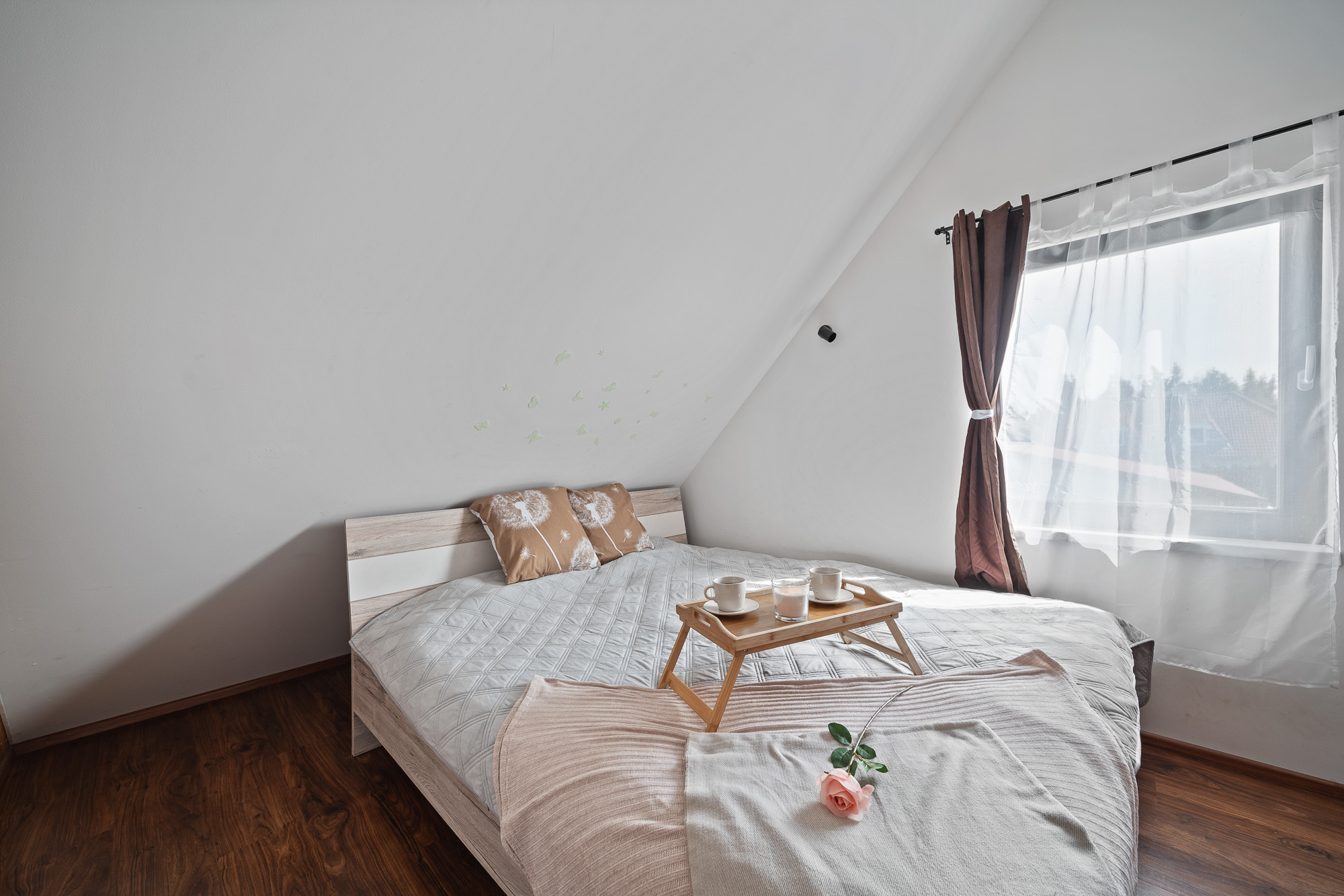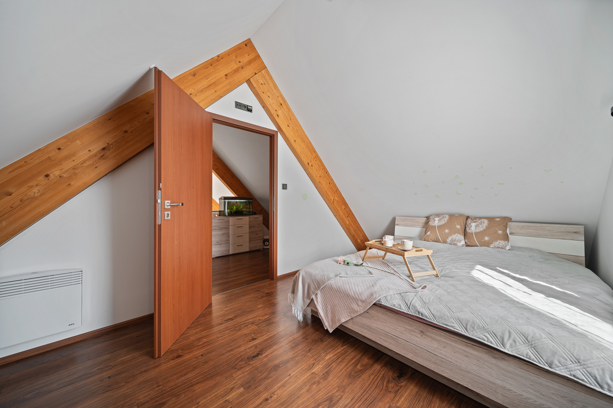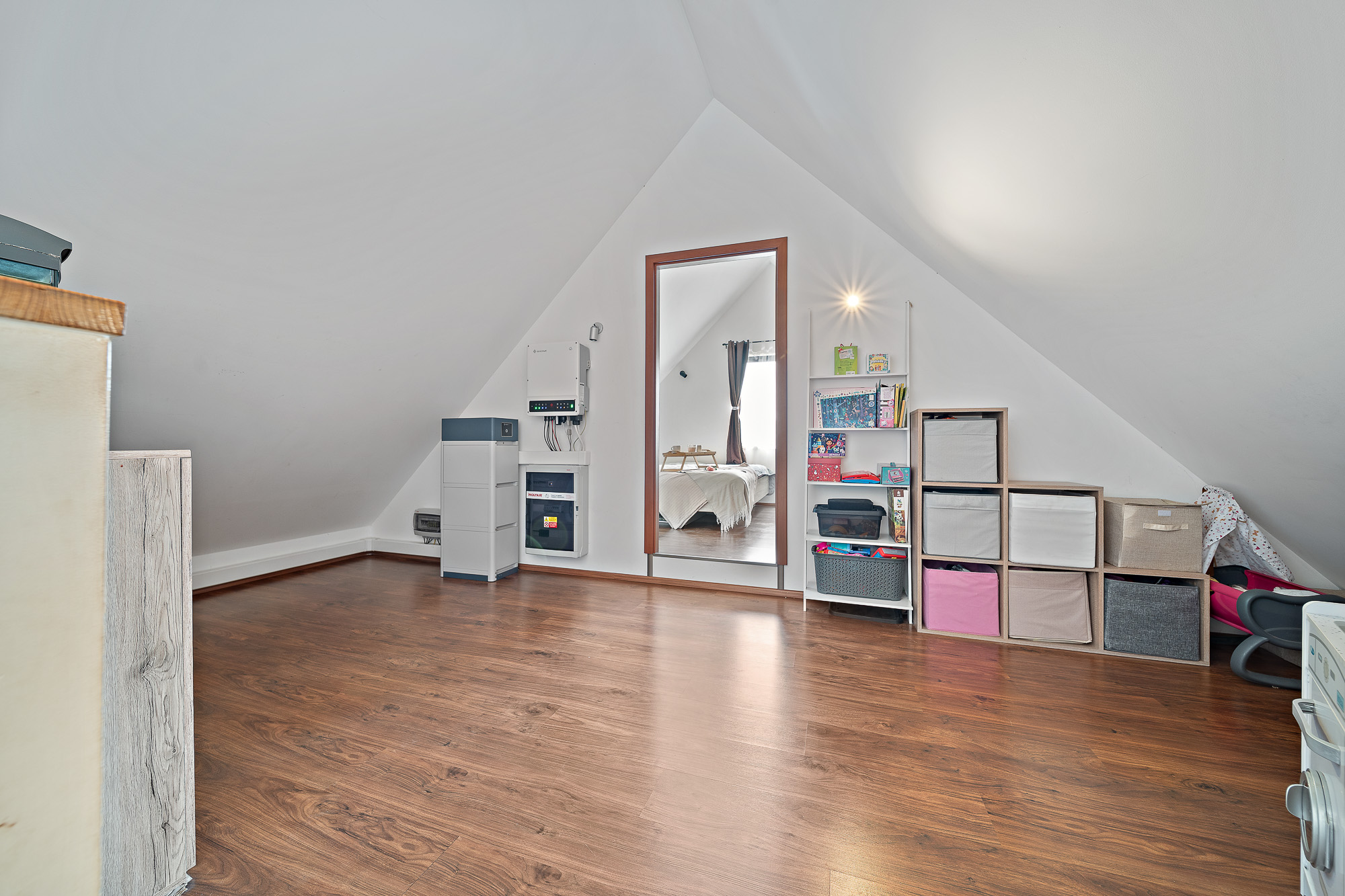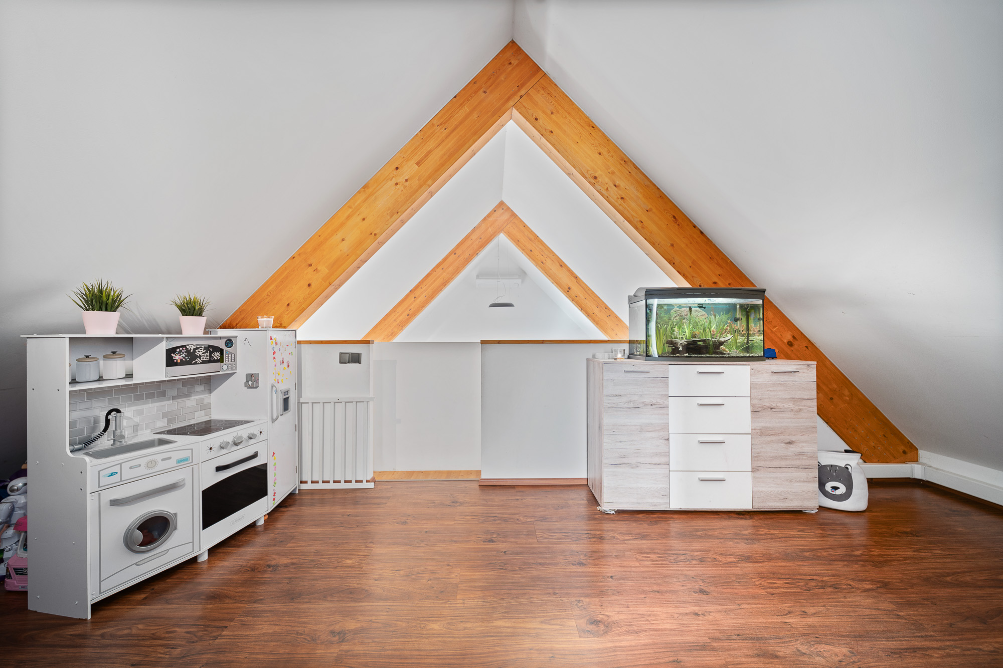 V podkroví je ložnice a otevřená galerie, která může sloužit jako pracovna nebo herna pro děti.