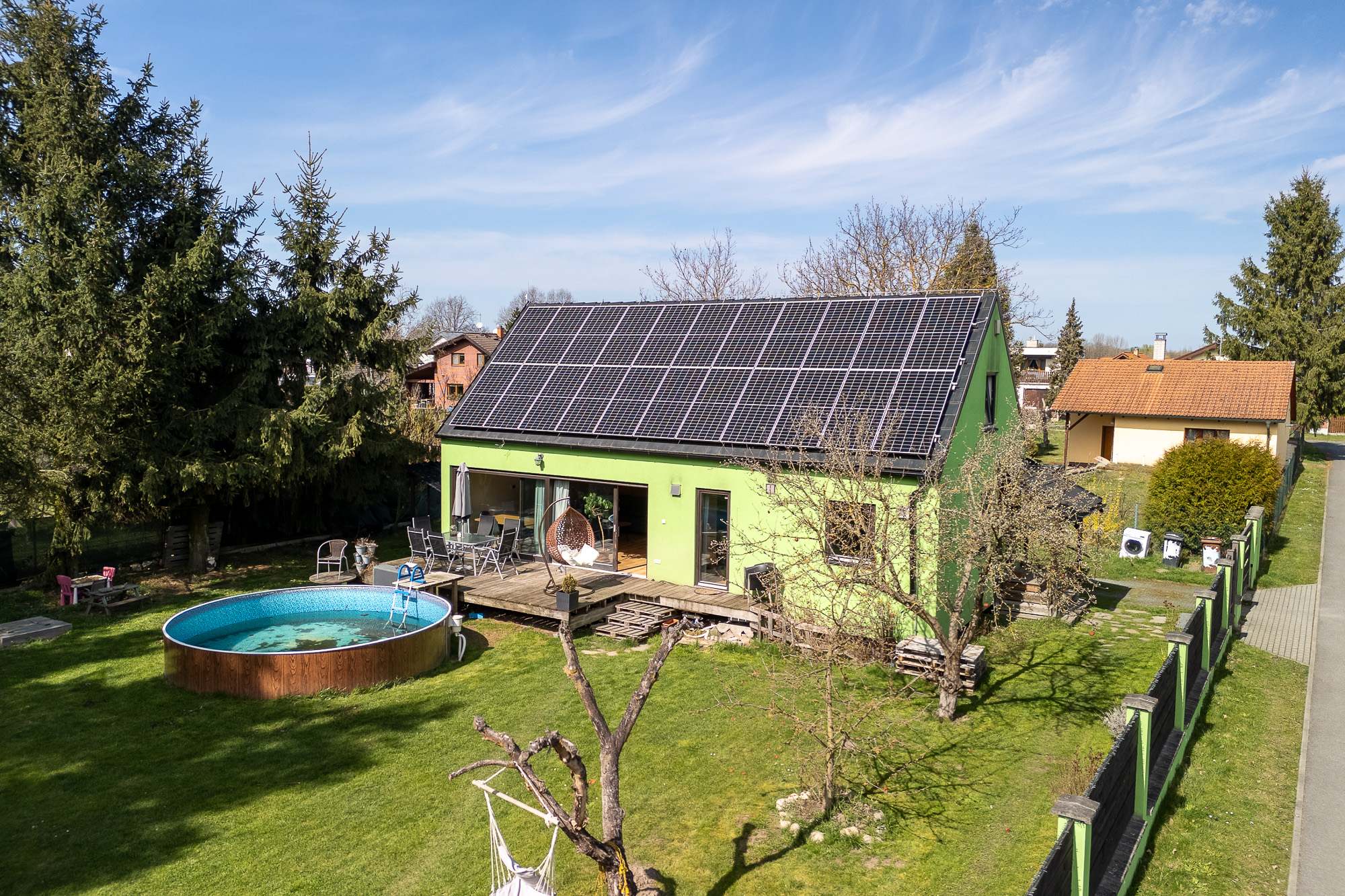 Je to energeticky nenáročná stavba. O komfort bydlení se stará tepelné čerpadlo, podlahové vytápění, rekuperace vzduchu a solární elektrárna.